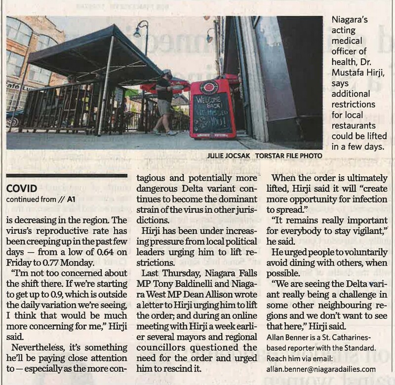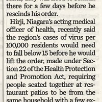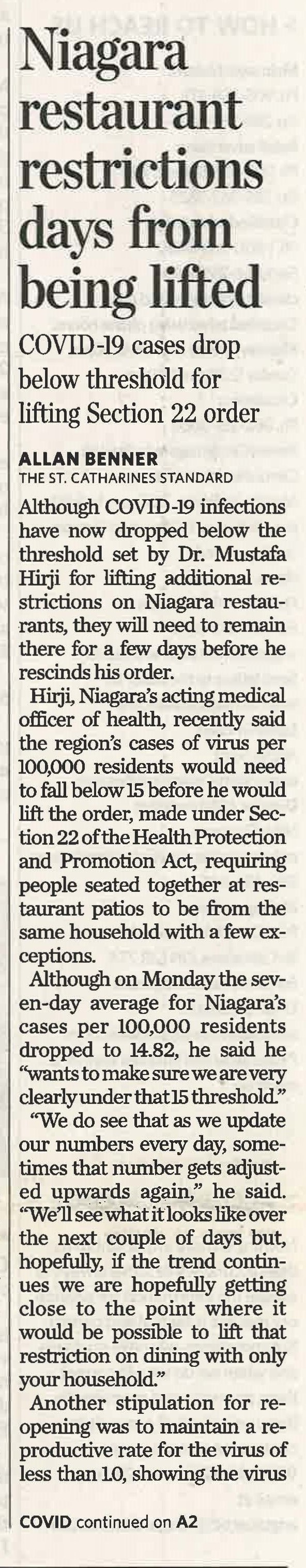- Niagara restaurant restrictions days from being lifted : COVID-19 cases drop below threshold for lifting Section 22 order