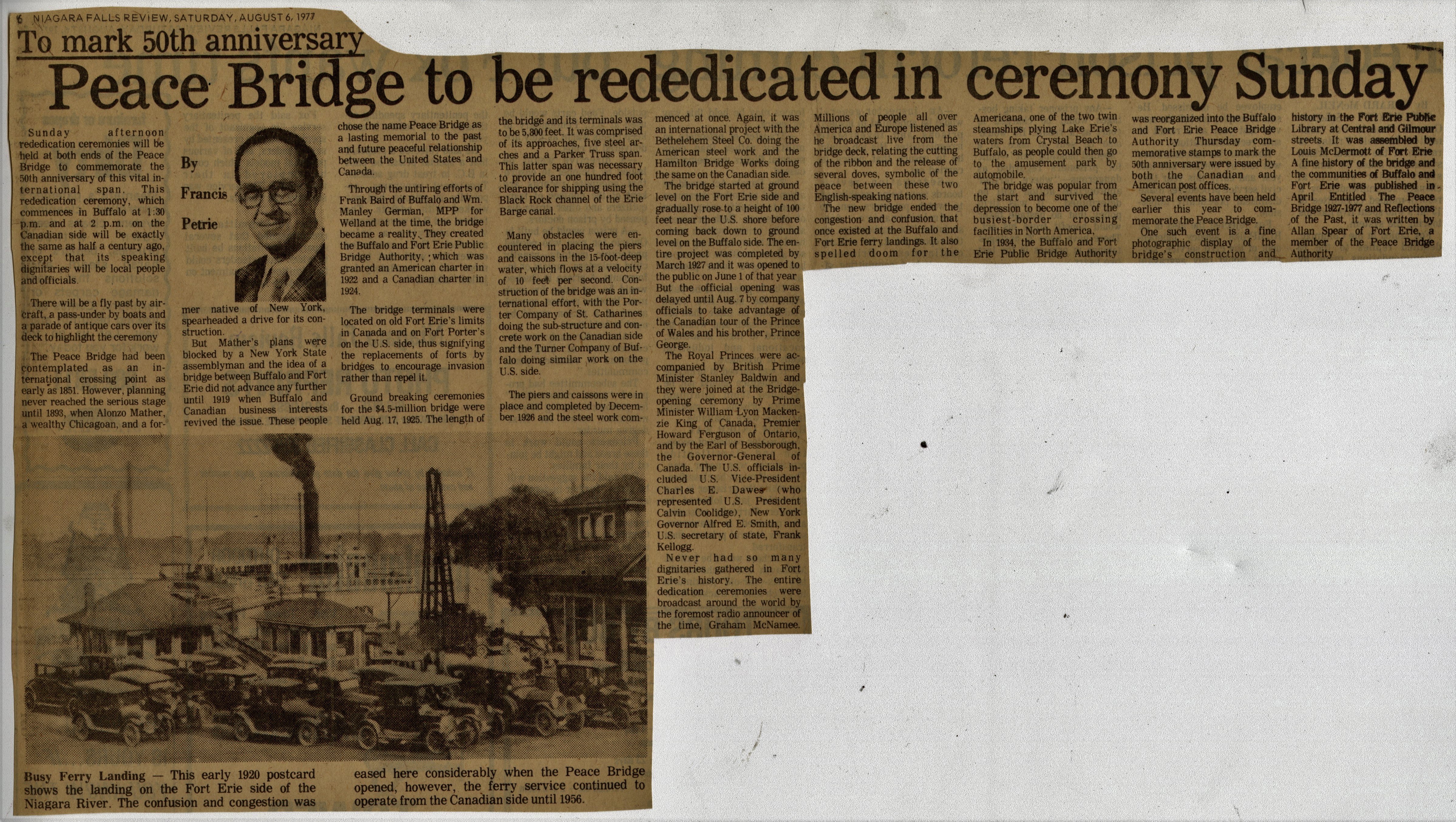 - To mark 50th anniversary : Peace Bridge to be rededicated in ceremony Sunday