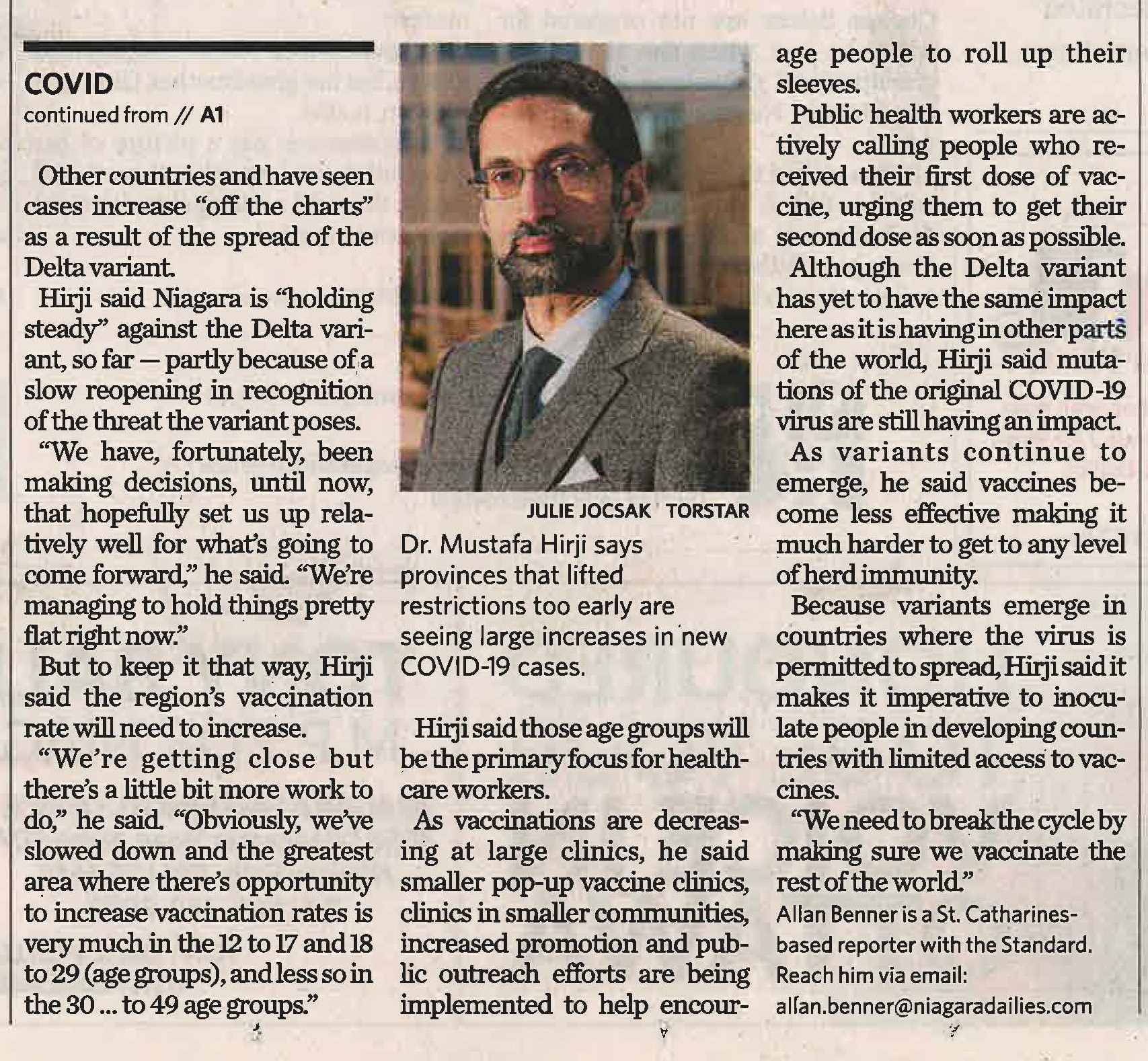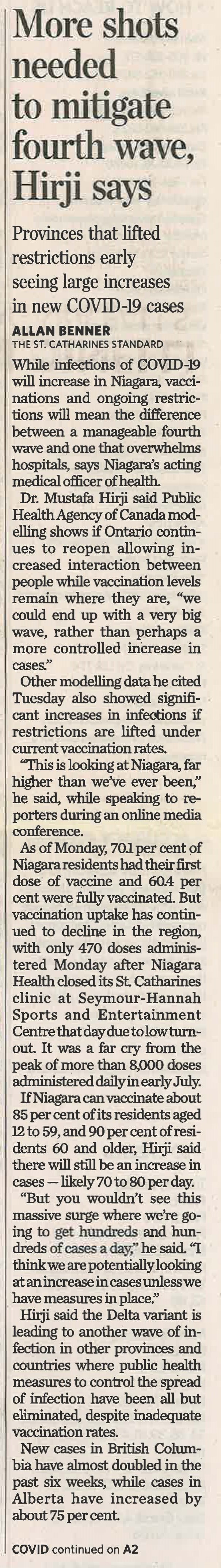 - More shots needed to mitigate fourth wave, Hirji says: Province that lifted restrictions early seeing large increases in new COVID-19 cases