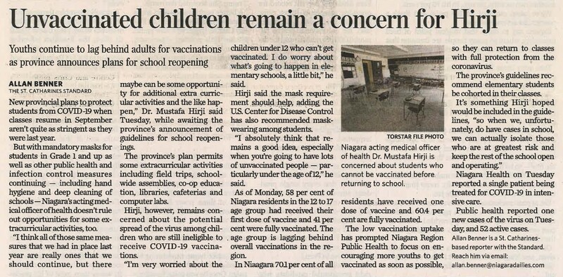 - Unvaccinated children remain a concern for Hirji: Youths continue to lag being adults for vaccinations as province announces plans for school reopening