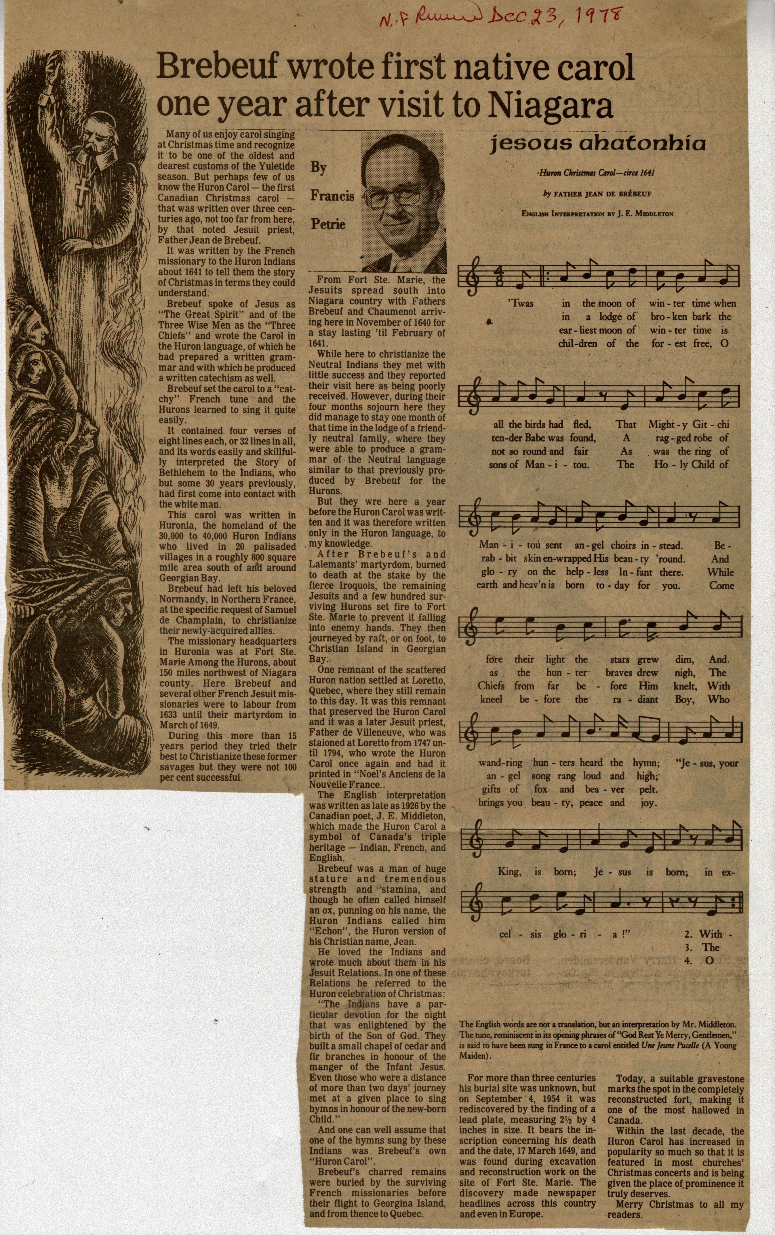 - Brebeuf wrote first native carol one year after visit to Niagara