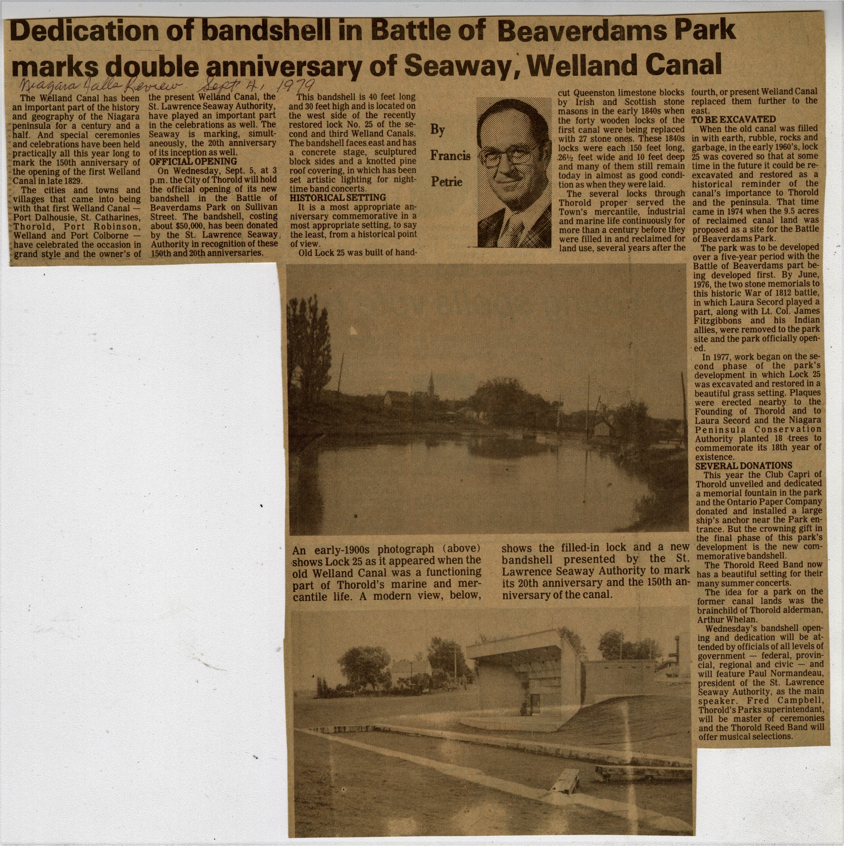 - Dedication of bandshell in Battle of Beaverdams Park marks double anniversary of Seaway, Welland Canal