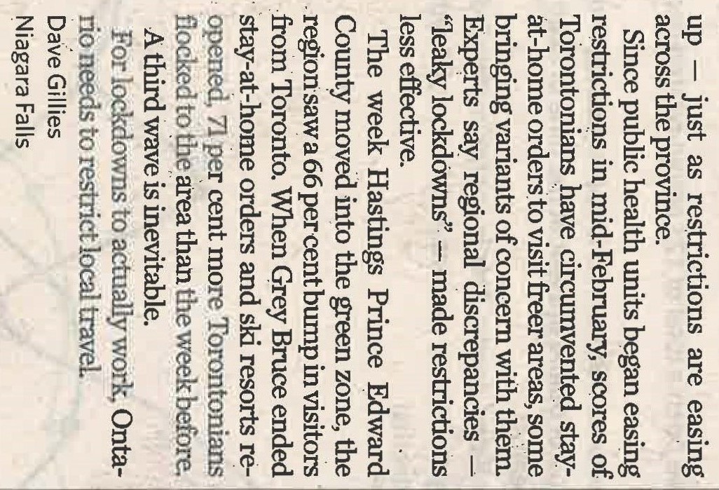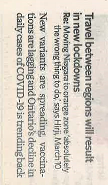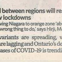 - Travel between regions will result in new lockdowns Re: moving Niagara to orange zone 'absolutely the wrong thing to do,' says Hirji, March 10