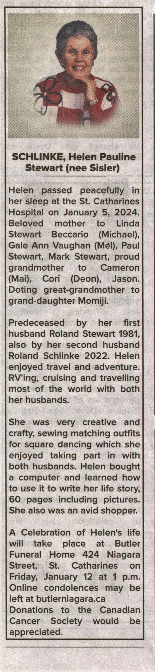 - Schlinke, Helen Pauline Stewart (nee Sisler)