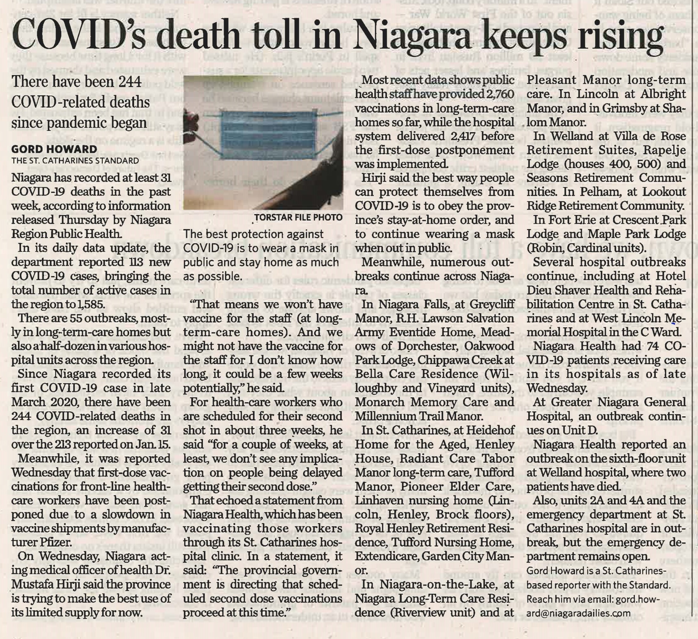 - COVID's death toll in Niagara keeps rising : There have been 244 COVID-related deaths since pandemic began