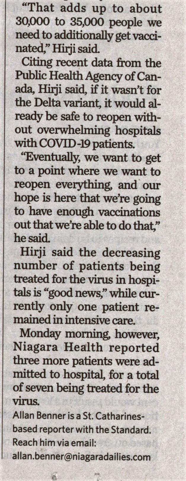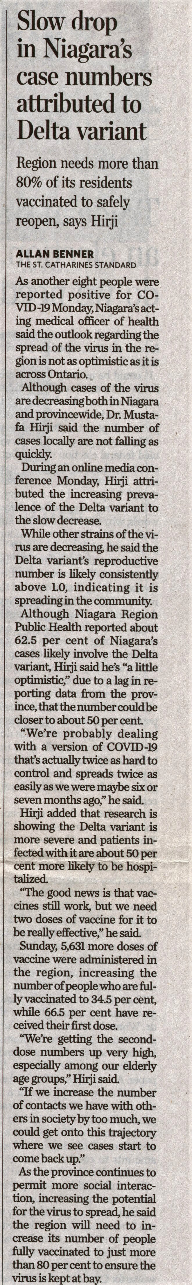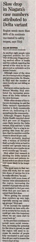 - Slow drop in Niagara's case numbers attributed to Delta variant : Region needs more than 80% of its residents vaccinated to safely reopen, says Hirji