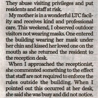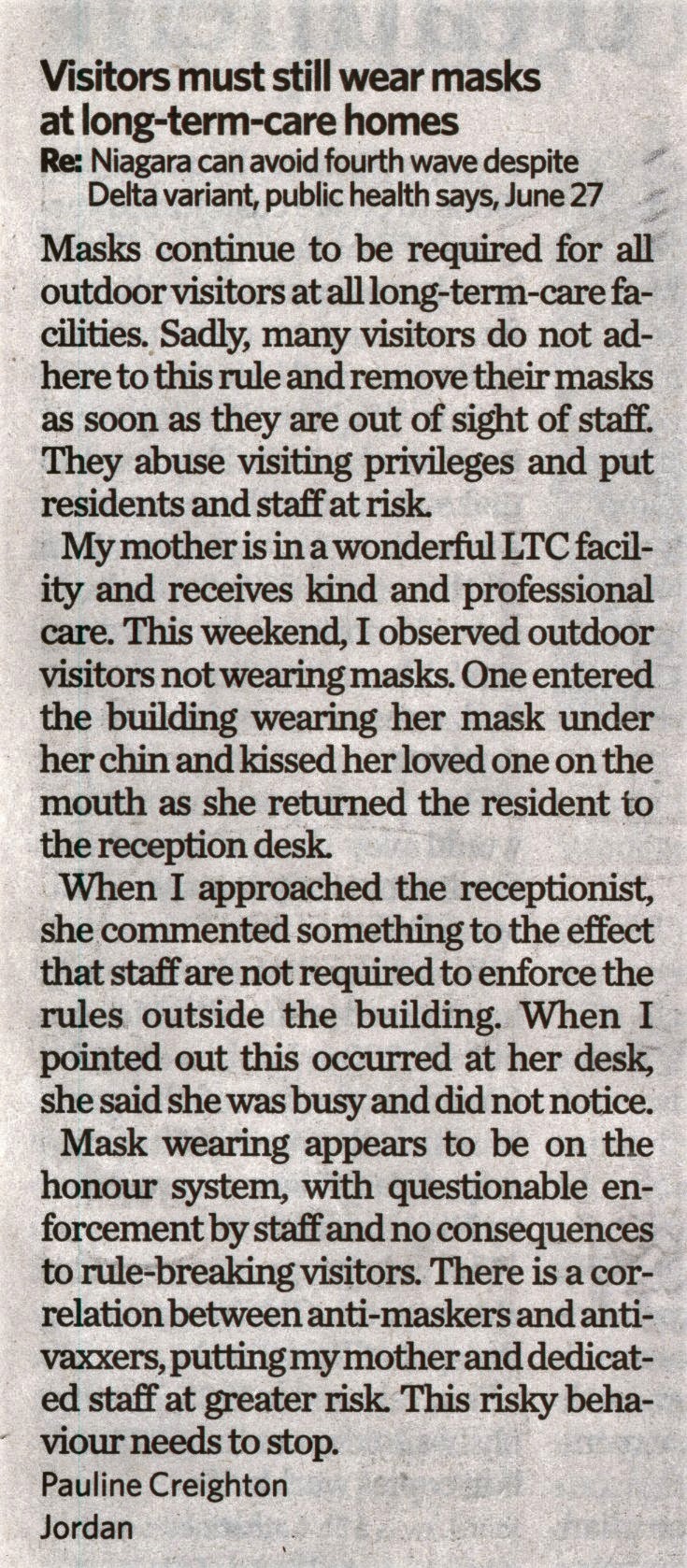 - Visitors must still wear masks at long-term-care homes : Re: Niagara can avoid fourth wave despite Delta variant, public health says, June 27