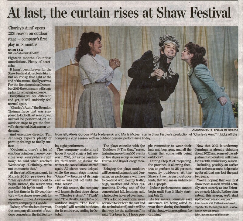 At last, the curtain rises at Shaw Festival : 'Charley's Aunt' opens 2021 season on outdoor stage --company's first play in 18 months