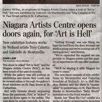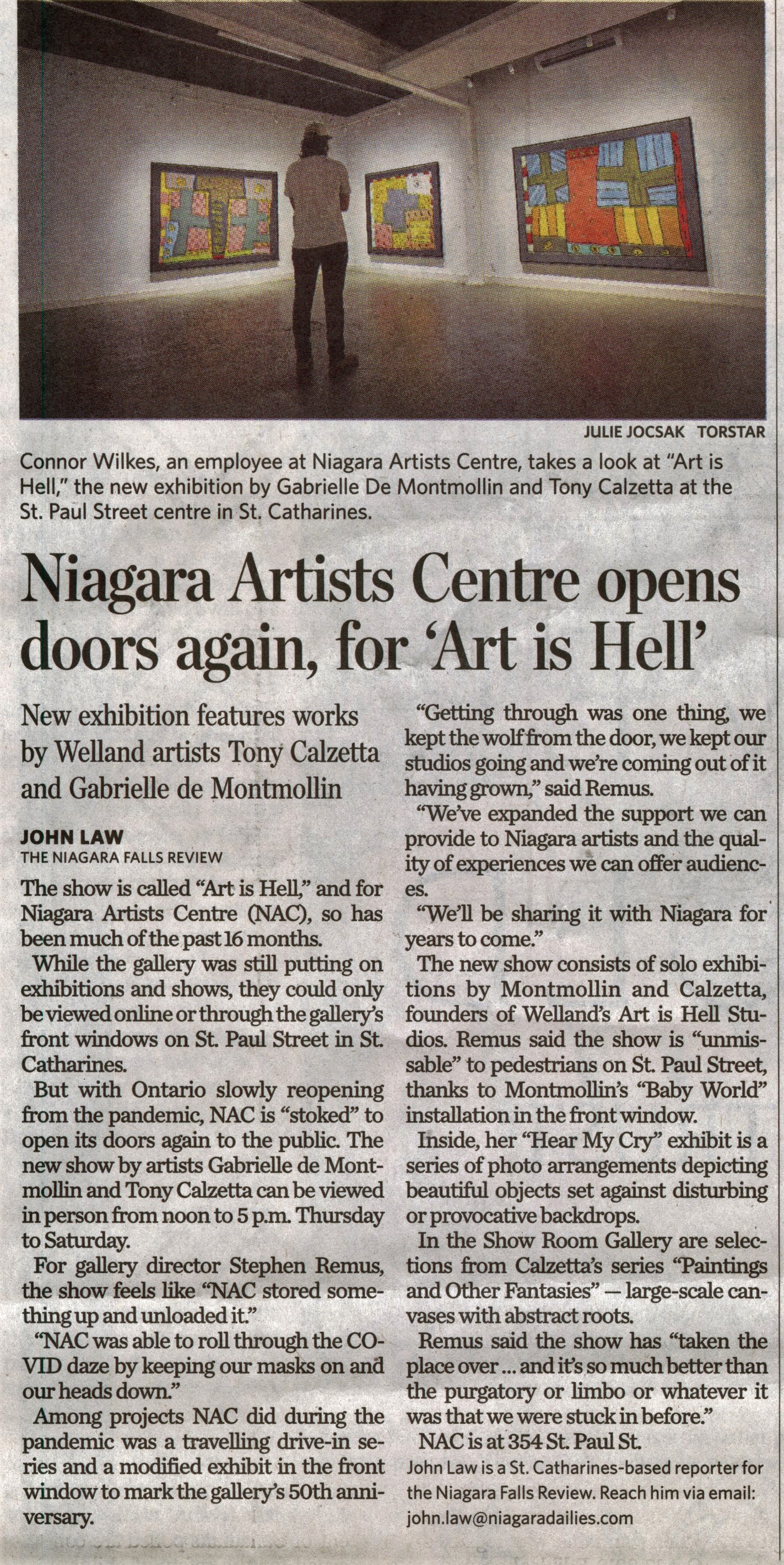 - Niagara Artists Centre opens doors again, for 'Art is Hell' : New exhibition features works by Welland artists Tony Calzetta and Gabrielle de Montmollin