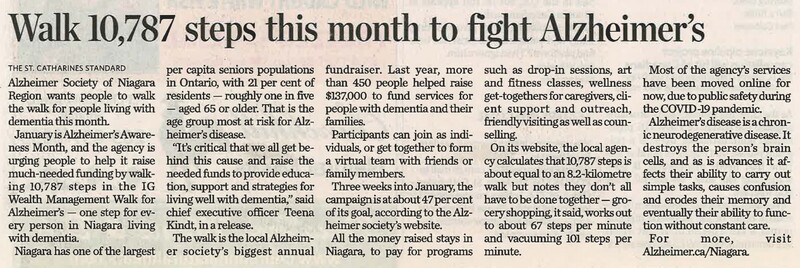 - Alzheimer Society of Niagara Region / Alzheimer Awareness month / IG Wealth Management Walk for Alzheimer's / Kindt, Teena / COVID 19 pandemic / online services
