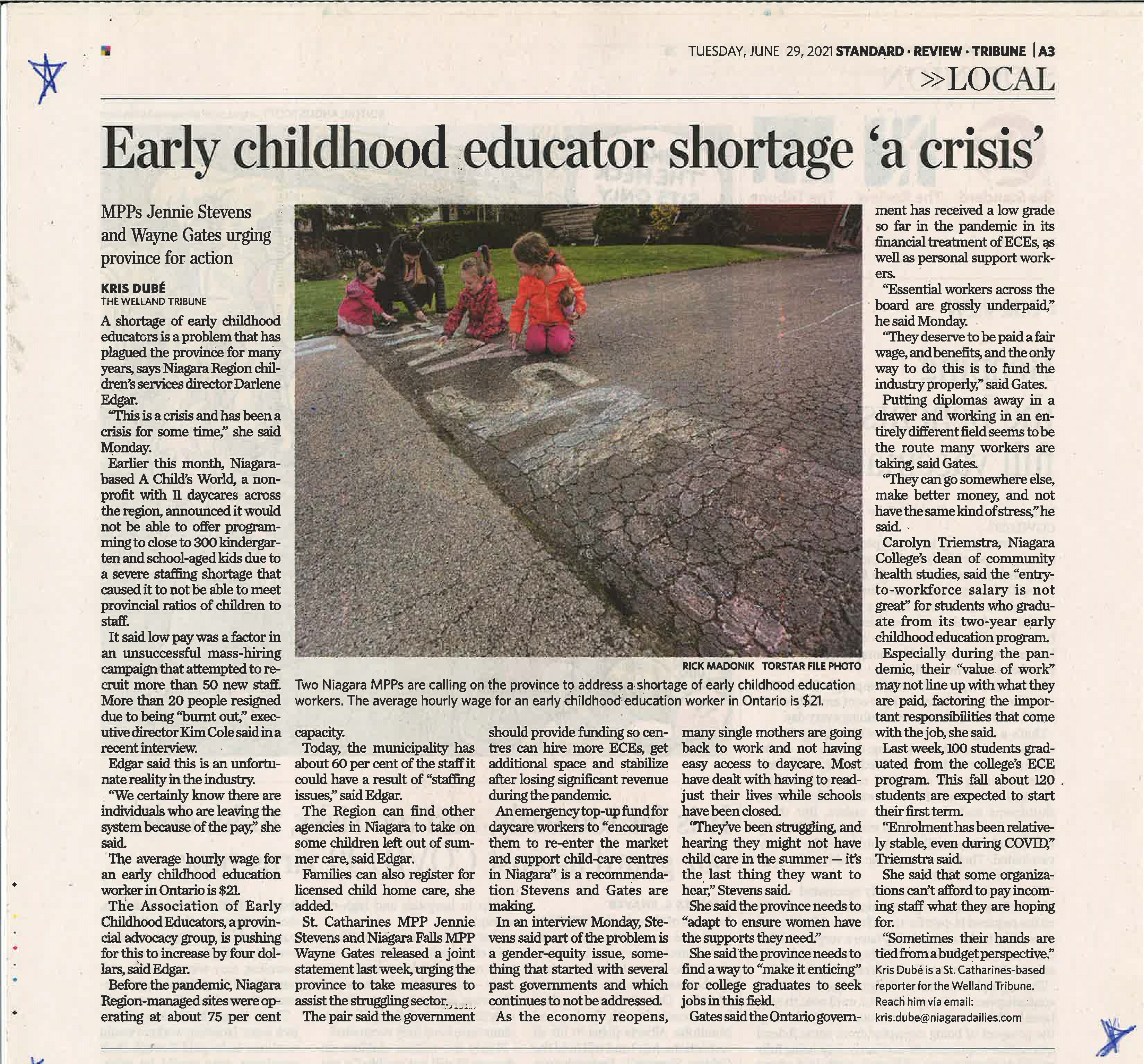 - Early childhood educator shortage a crisis : MPPs Jennie Stevens and Wayne Gates urging province for action