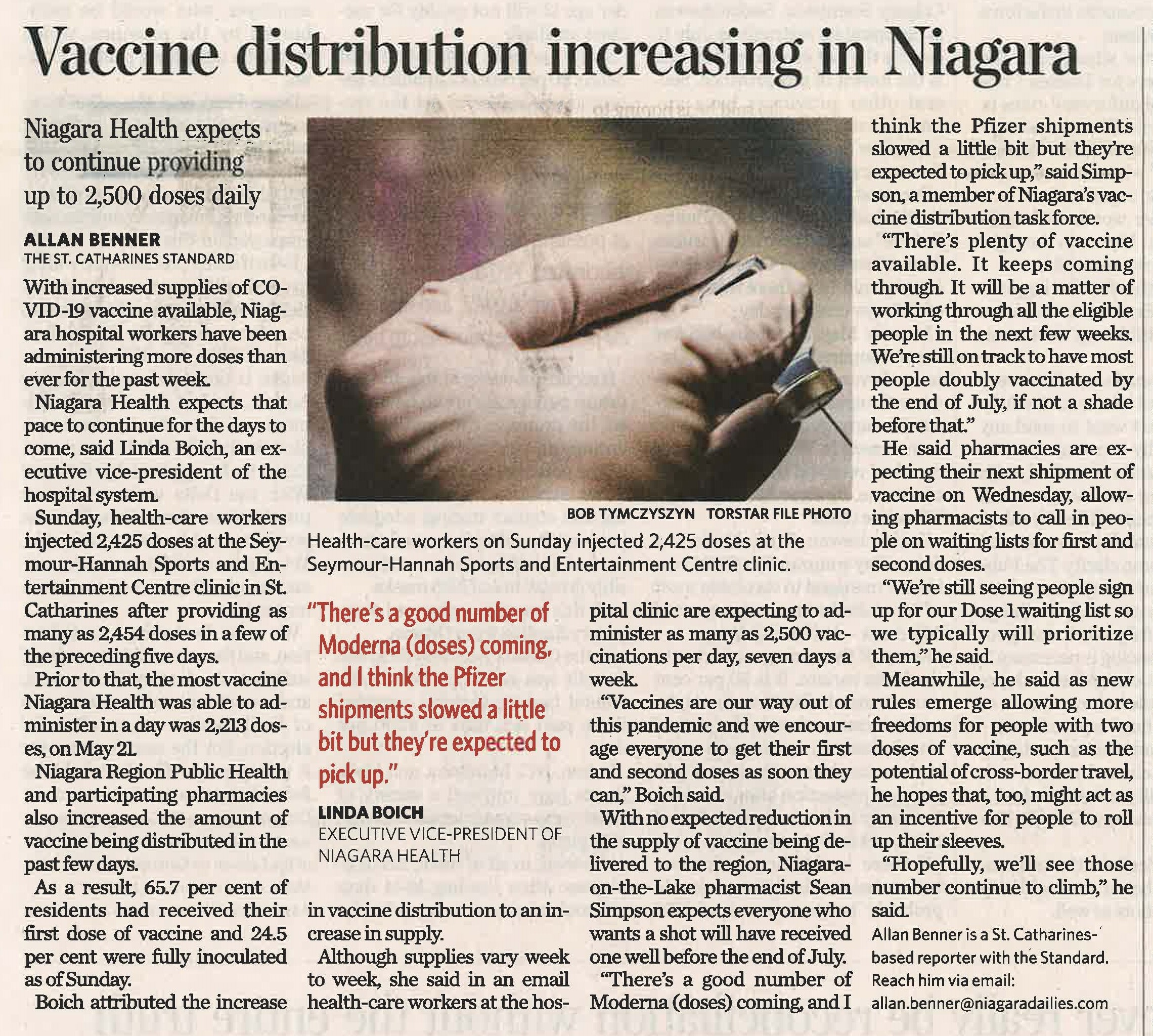 - Vaccine distribution increasing in Niagara : Niagara Health expects to continue providing up to 2,500 doses daily