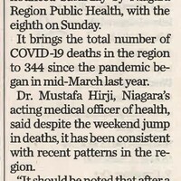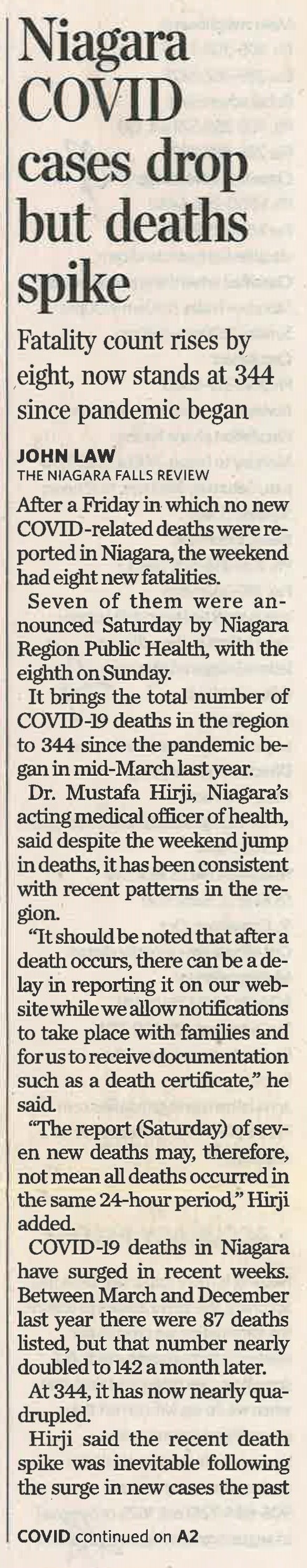 - Niagara COVID cases drop but deaths spike : Fatality count rises by eight, now stands at 344 since pandemic began