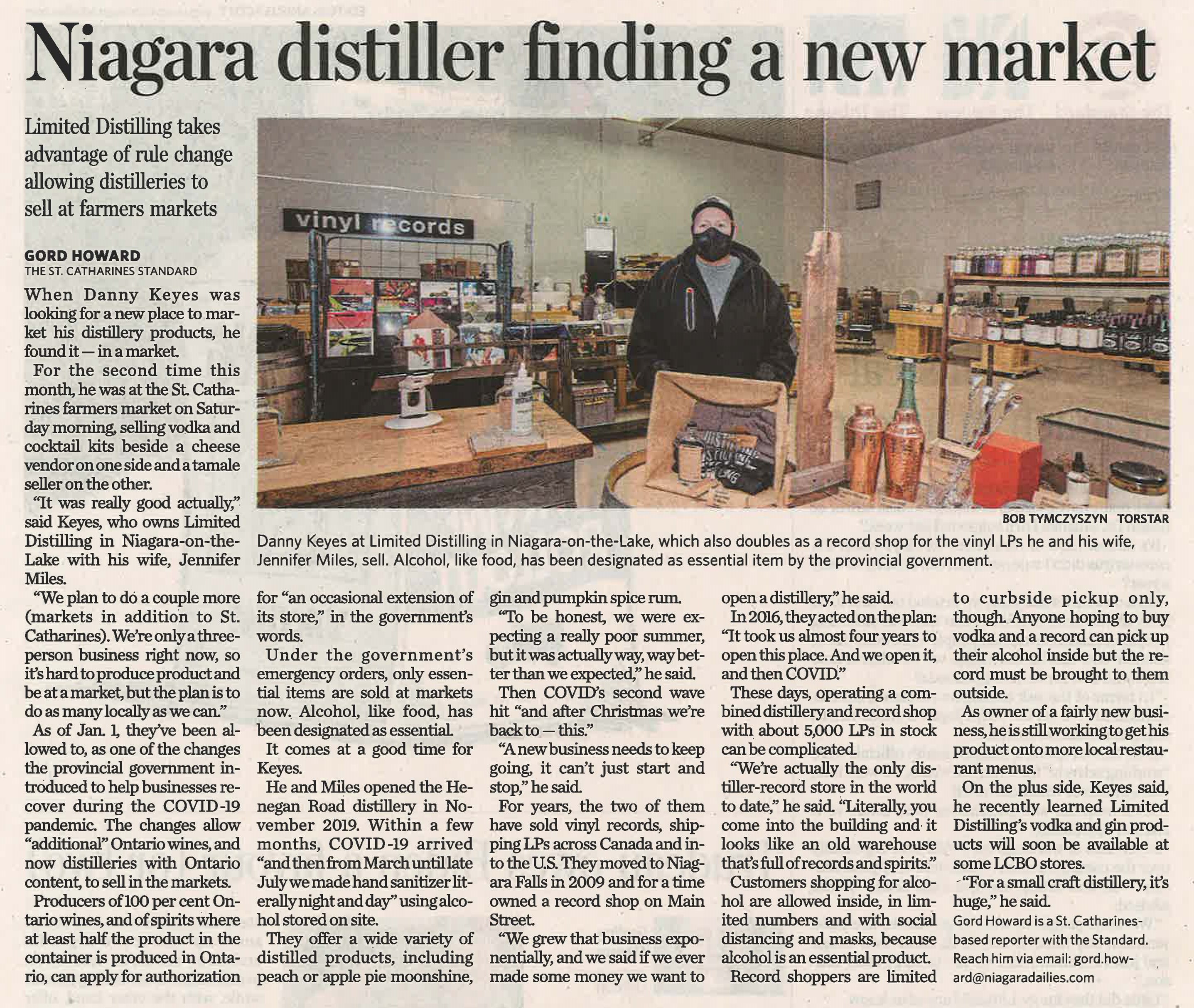 - Niagara distiller finding a new market : Limited Distilling takes advantage of rule change allowing distilleries to sell at farmers markets