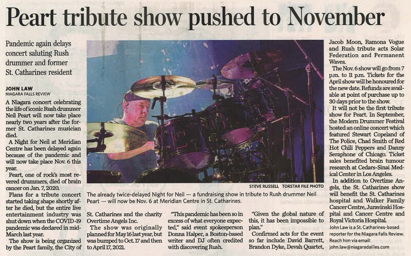 - Night for Neil / Peart, Neil / Meridian Centre / Rush / COVID 19 pandemic / Overtime Angels Inc. / Halper, Donna / Barrett, David / Dyke, Brandon / Devah Quartet / Moon, Jacob / Ramona Vogue / Solar Federation / Permanent Waves / Walker Family Cancer Centre / Juravinski Hospital and Cancer Centre / Royal Victoria Hospital