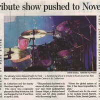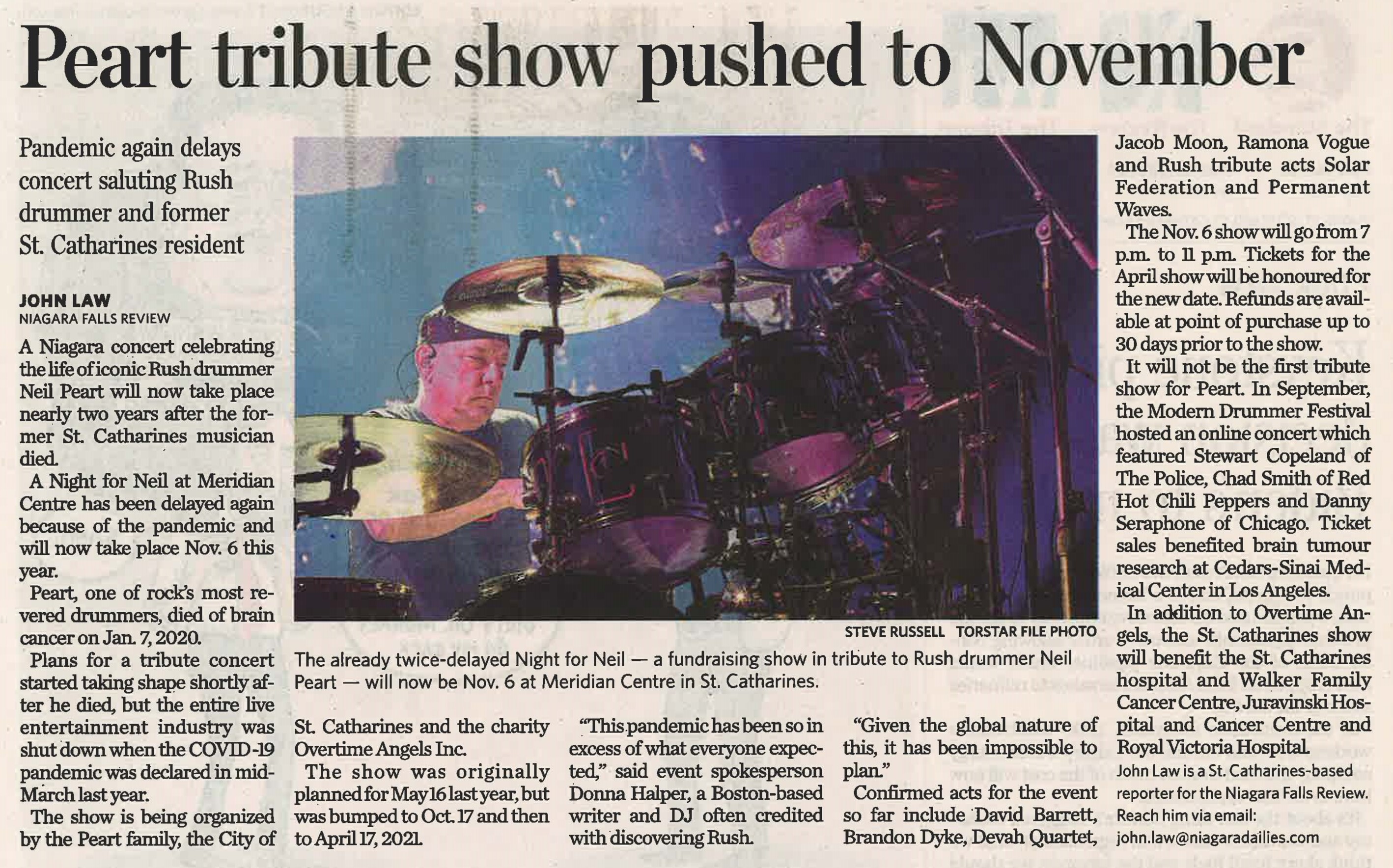- Peart tribute show pushed to November : Pandemic again delays concert saluting Rush drummer and former St. Catharines resident