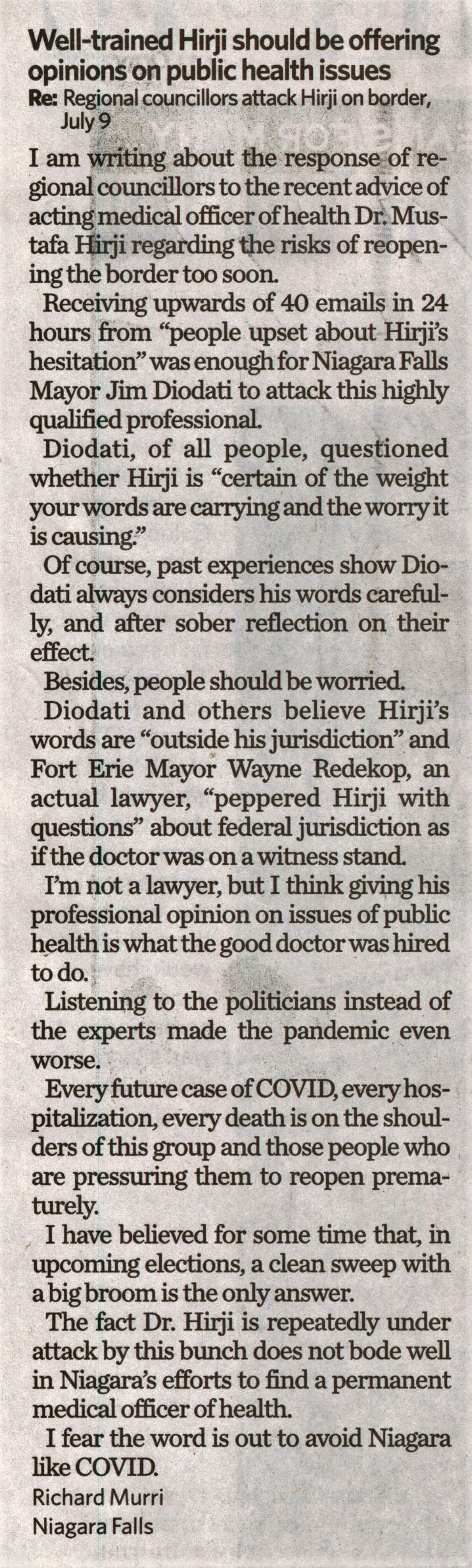 - Well-trained Hirji should be offering opinions on public health issues : Re: Regional councillors attack Hirji on border, July 9