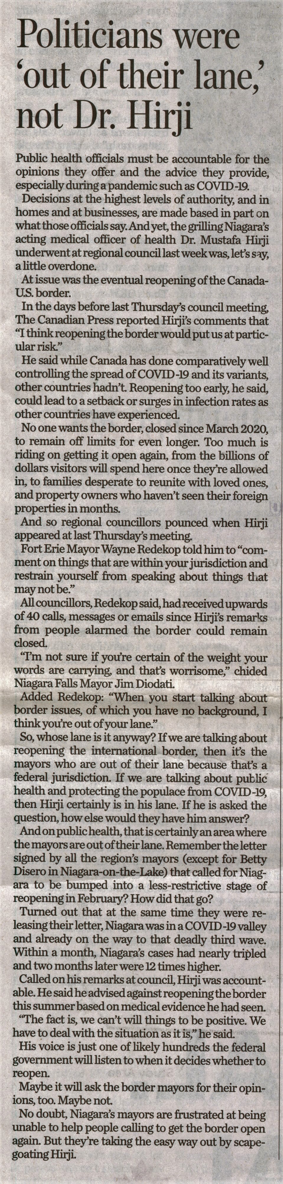 - Politicians were 'out of their lane,' not Dr. Hirji