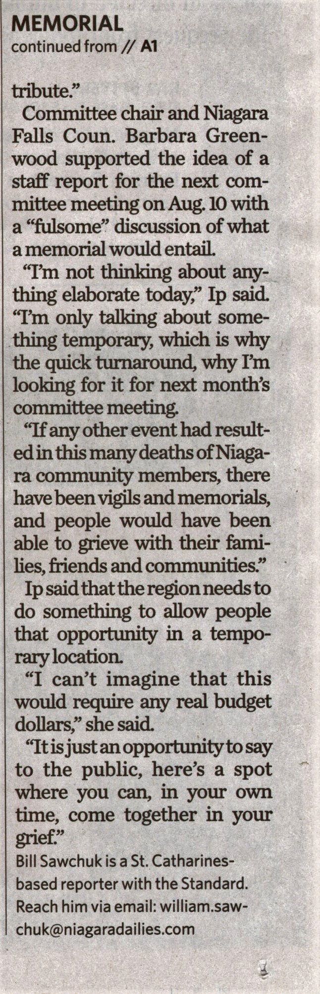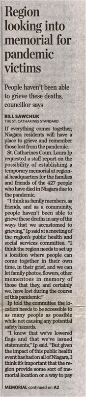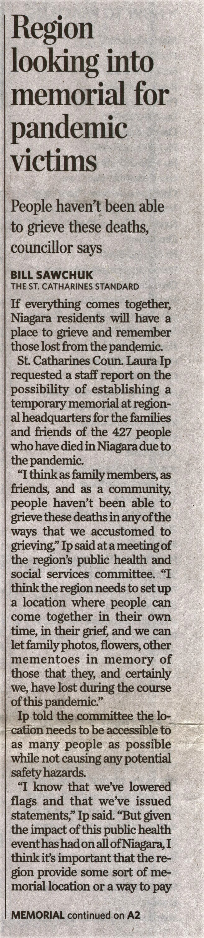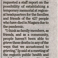 - Region looking into memorial for pandemic victims : People haven't been able to grieve these deaths, councillor says