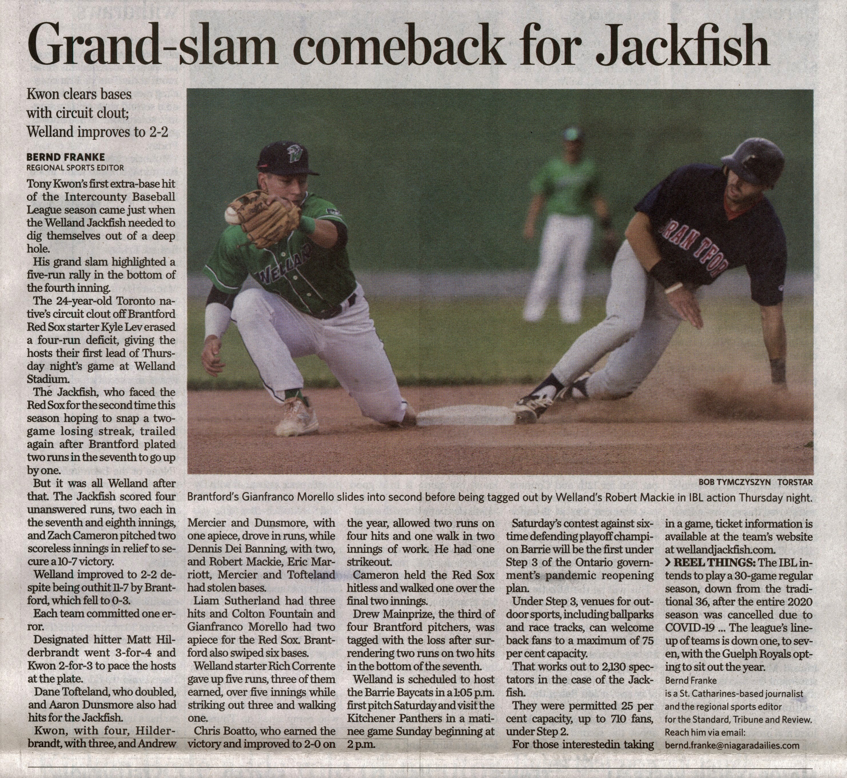 - Grand-slam comeback for Jackfish : Kwon clears bases with circuit clout; Welland improves to 2-2