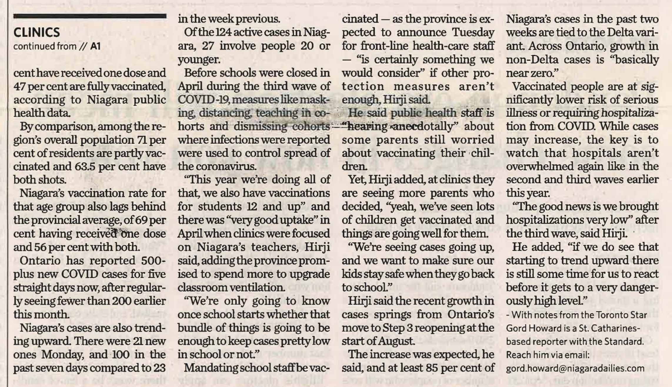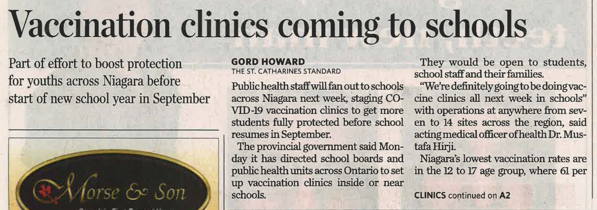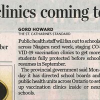 - Vaccination clinics coming to schools: Part of effort to boost protection for youths across Niagara before start of new school year in September
