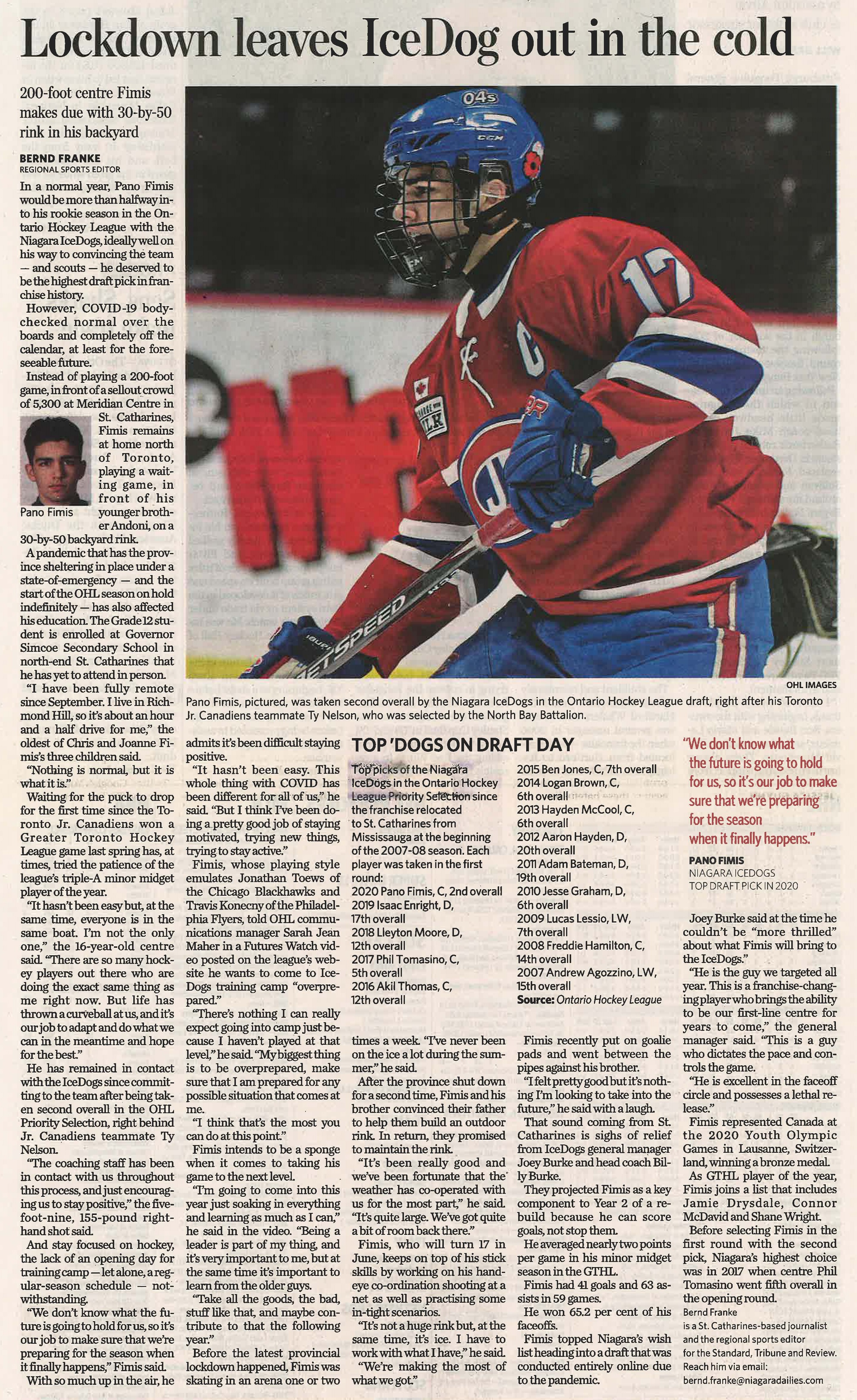 Lockdown leaves IceDog out in the cold : 200 foot centre Fimis makes due with 30-by-50 rink in his backyard