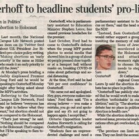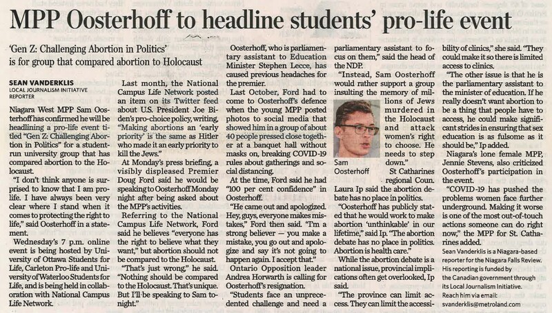 - MPP Oosterhoff to headline students' pro-life event : 'Gen-Z: Challenging Abortion in Politics' is for group that compared abortion to Holocaust