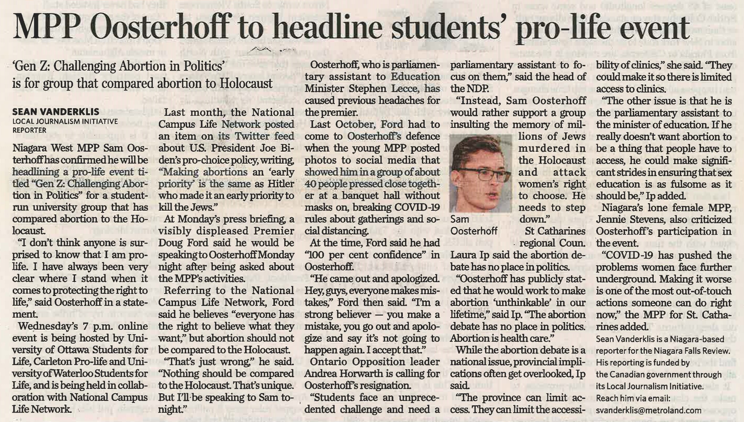 MPP Oosterhoff to headline students' pro-life event : 'Gen-Z: Challenging Abortion in Politics' is for group that compared abortion to Holocaust