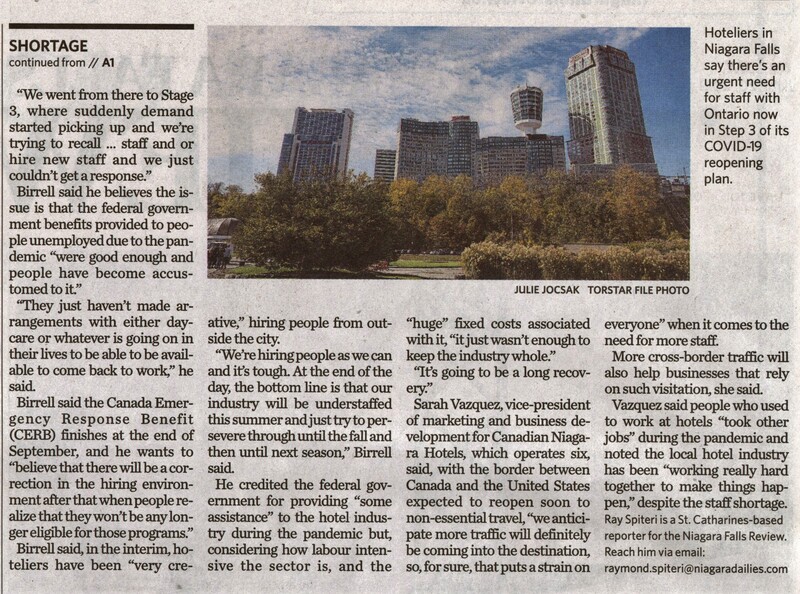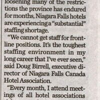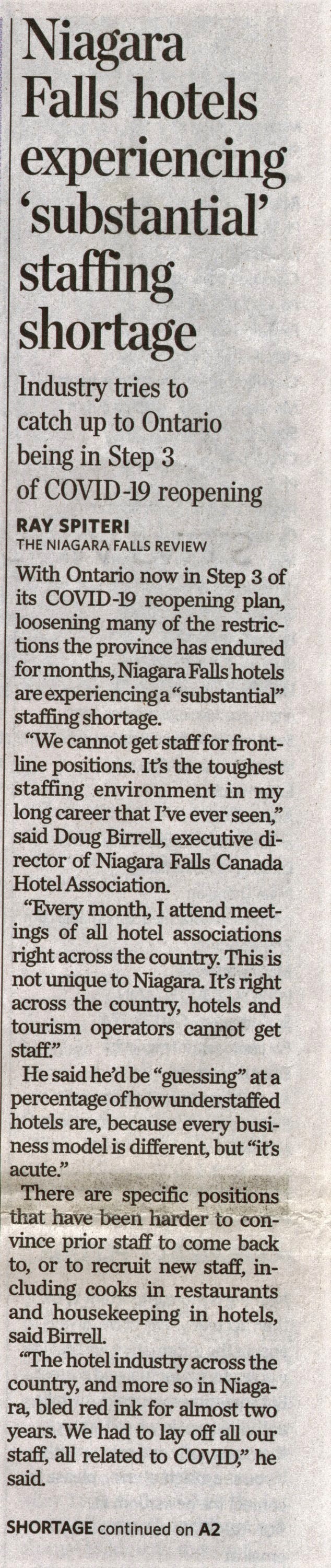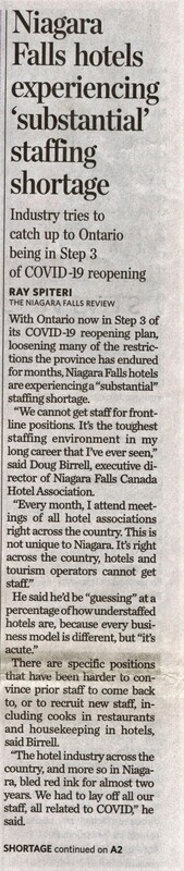 - Niagara Falls hotels experiencing 'substantial' staffing shortage : Industry tries to catch up to Ontario being in Step 3 of COVID-19 reopening