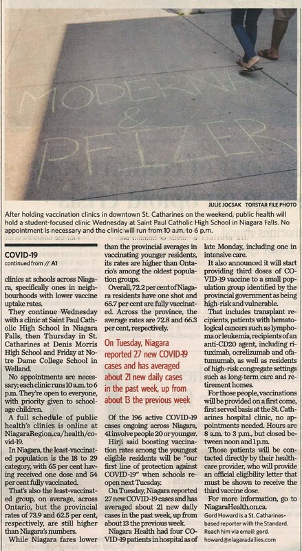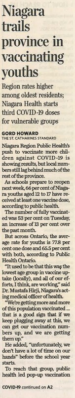 - Niagara trails province in vaccinating youths : Region rates higher among oldest residents : Niagara Health starts third COVID-19 doses for vulnerable groups