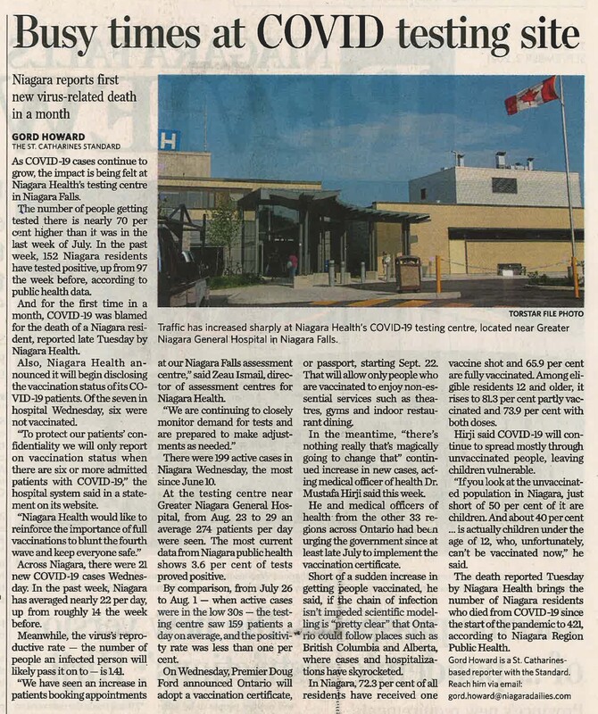 - Busy times at COVID testing site : Niagara reports first new virus-related death in a month