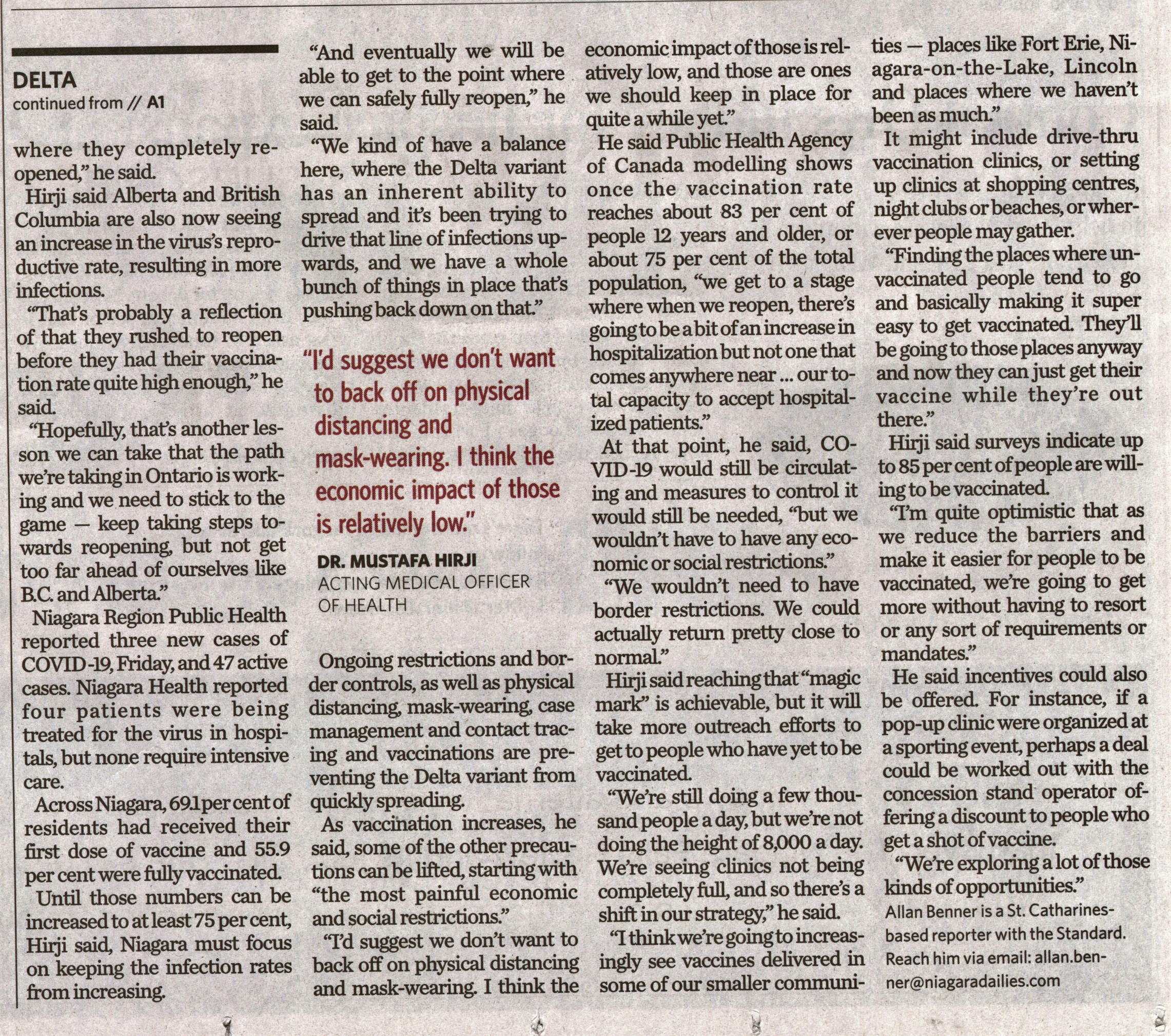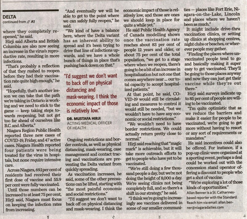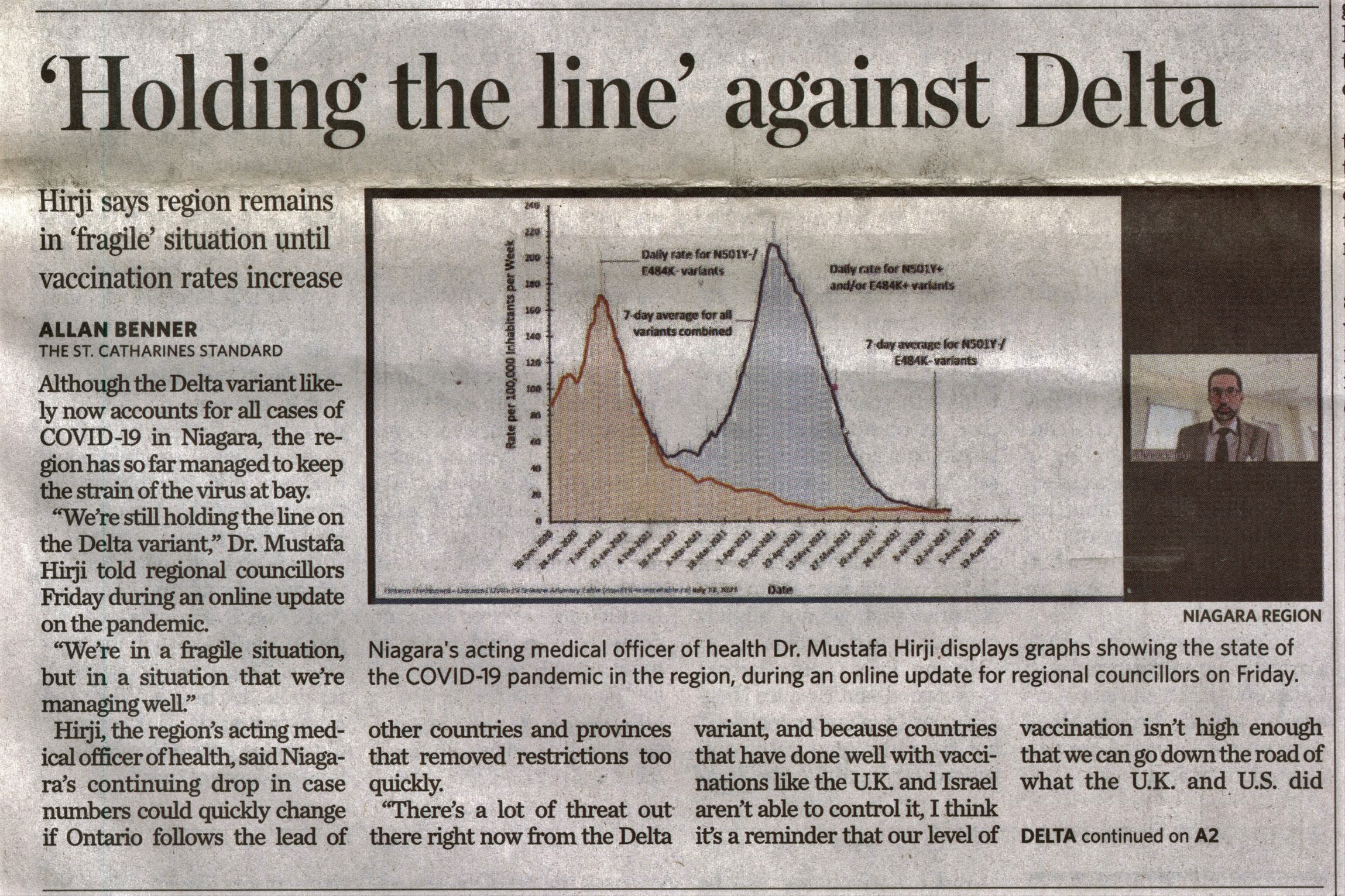 - ''Holding the line' against Delta : Hirji says region remains in 'fragile' situation until vaccination rates increase