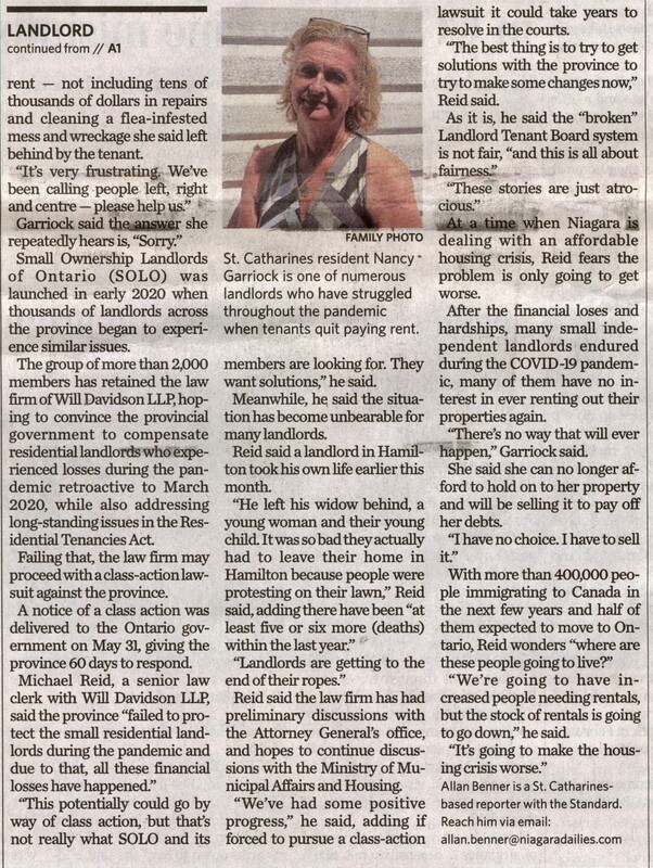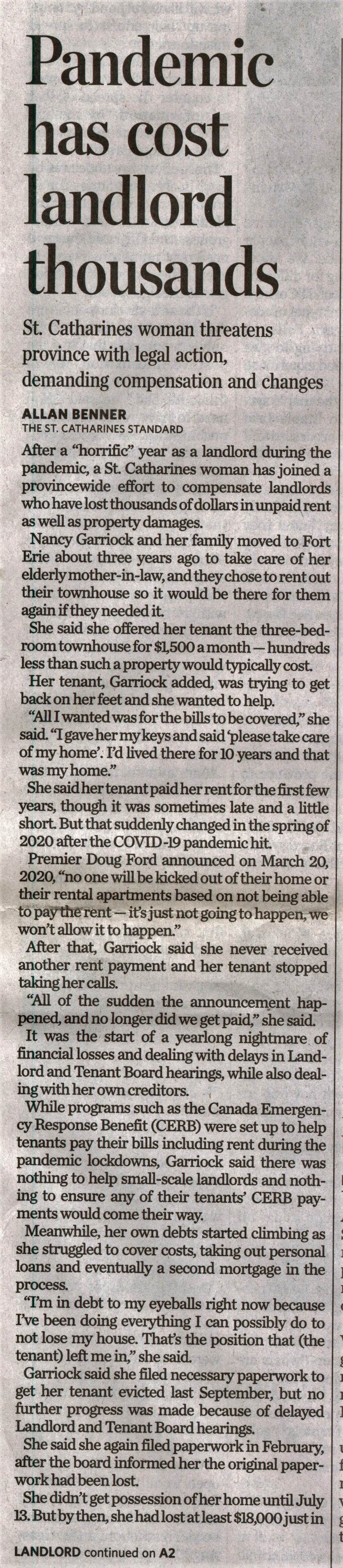 - Pandemic has cost landlord thousands : St. Catharines woman threatens province with legal action, demanding compensation and changes