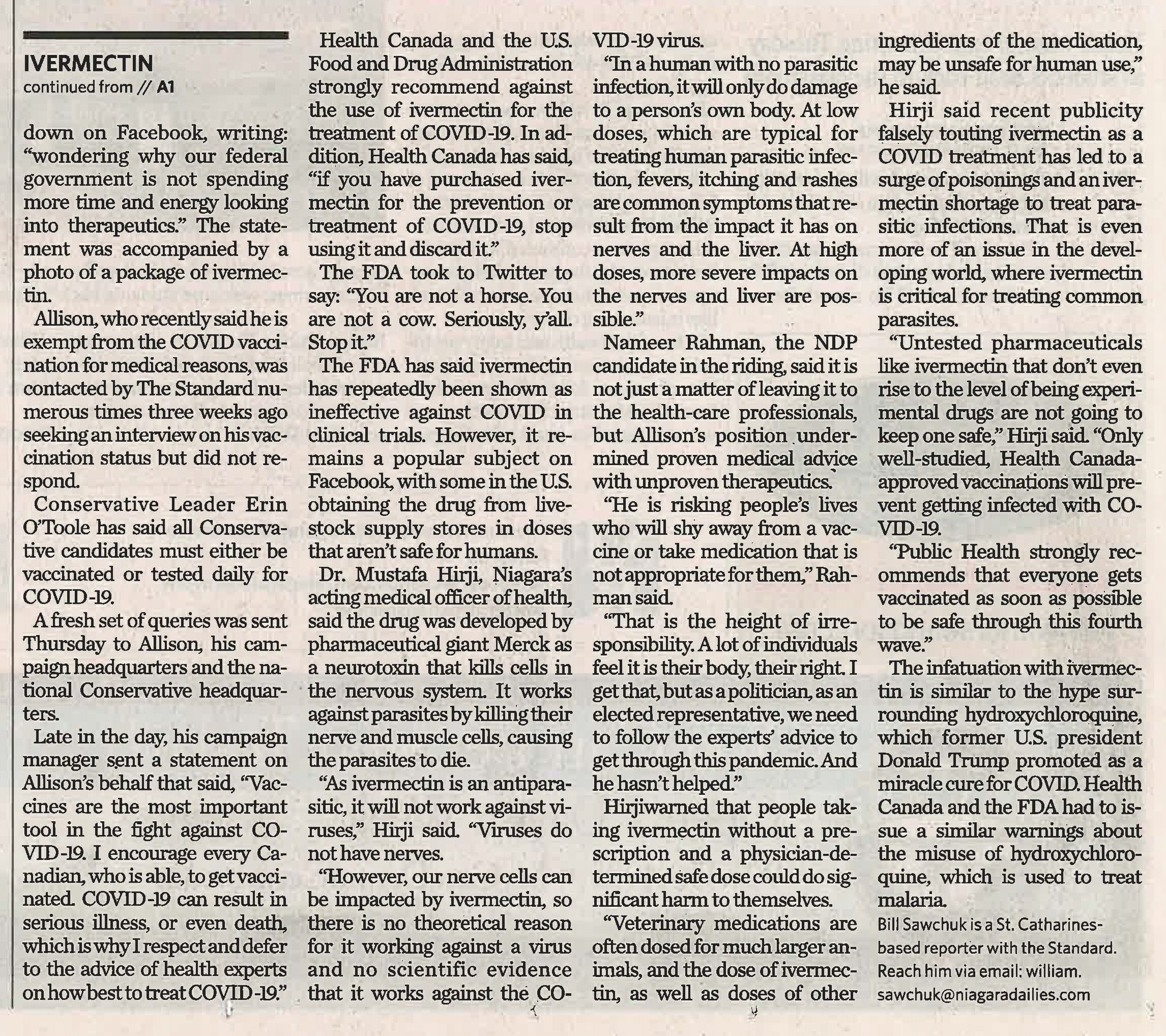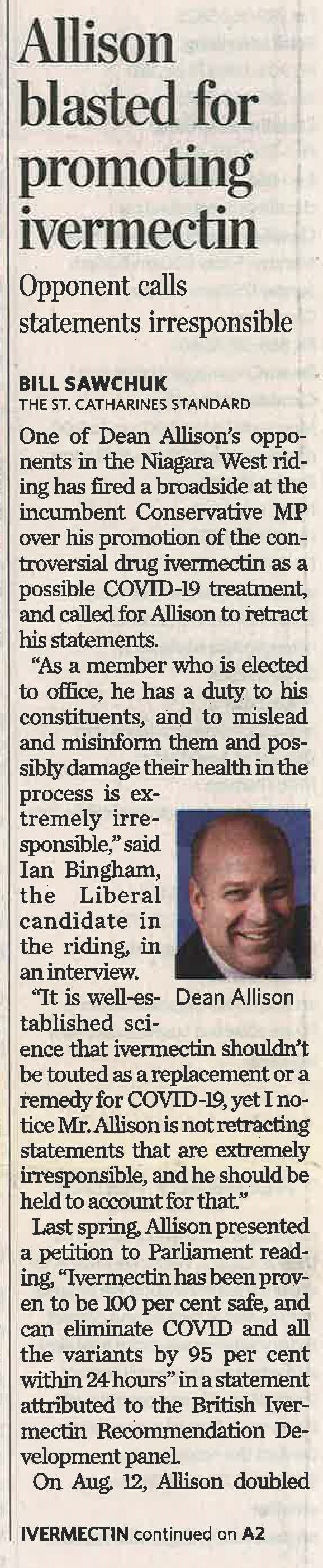 - Allison blasted for promoting ivermectin : opponent calls statements irresponsible
