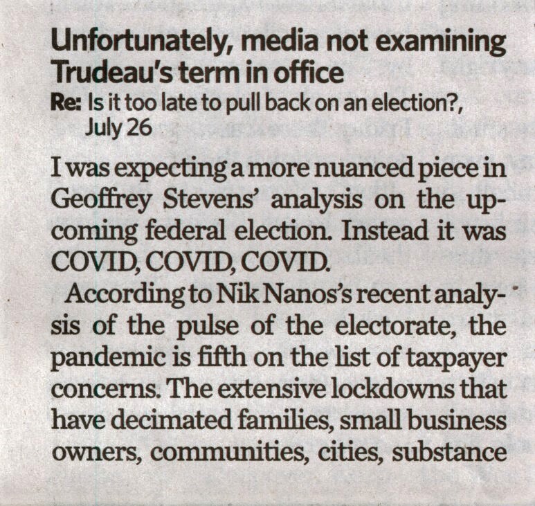 Unfortunately, media not examining Trudeau's term in office : Re: Is it too late to pull back on an election?, July 26