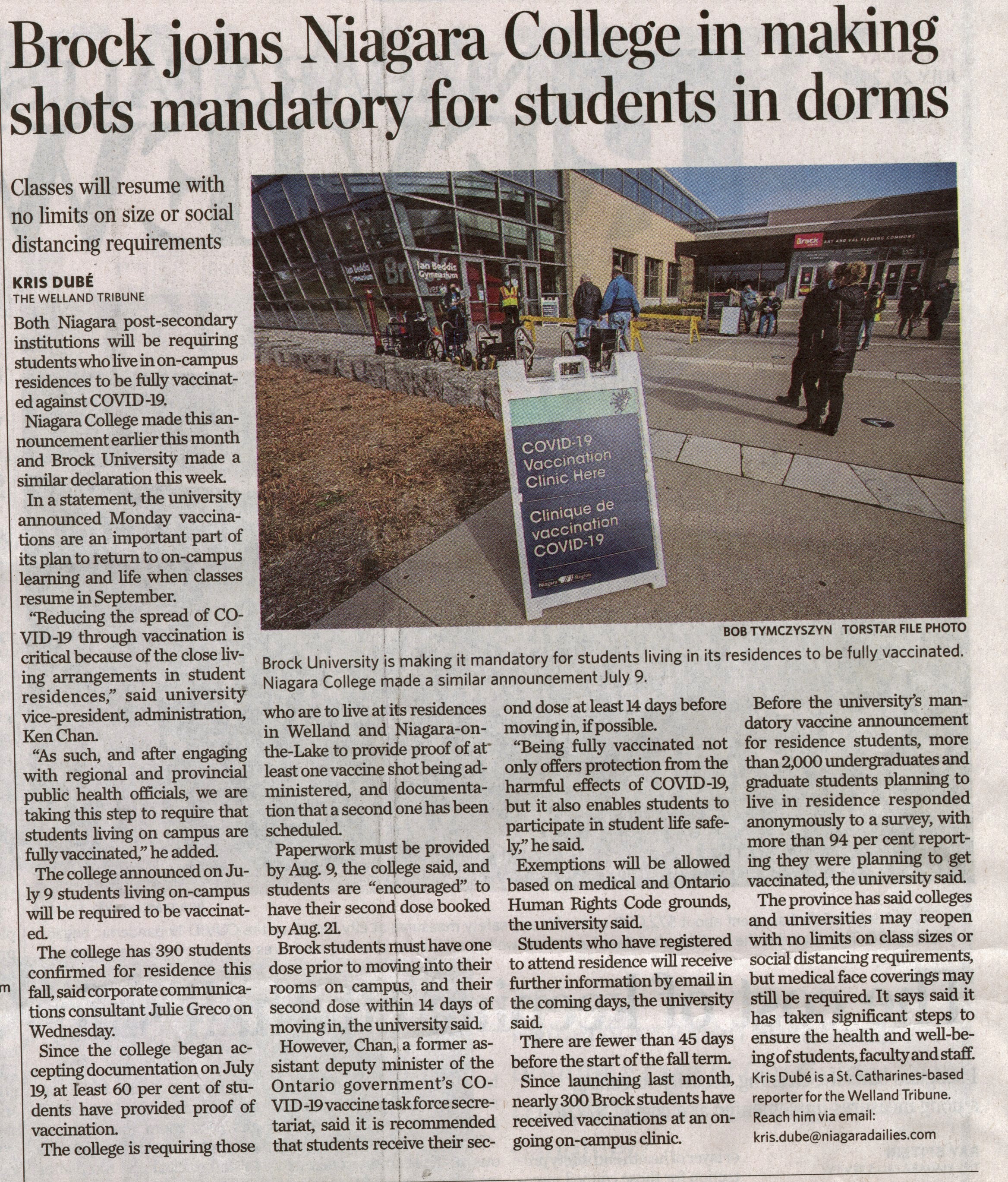 - Brock joins Niagara College in making shots mandatory for students in dorms : Classes will resume with no limits on size or social distancing requirements