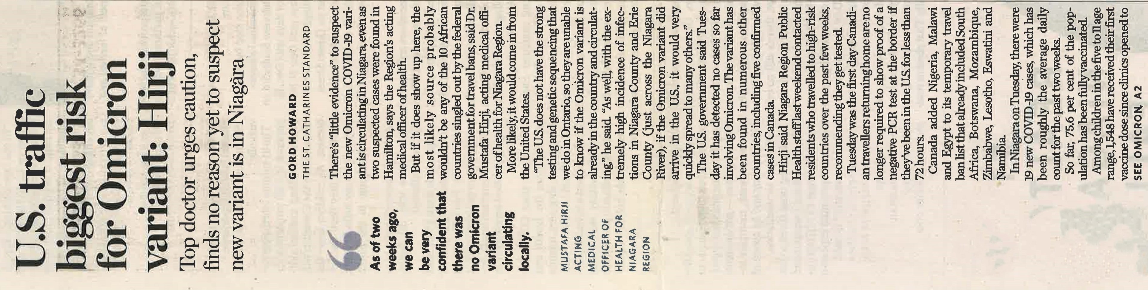 - U.S. traffic biggest risk for Omicron variant: Hirji :Top doctor urges caution, finds no reason yet to suspect new variant is in Niagara