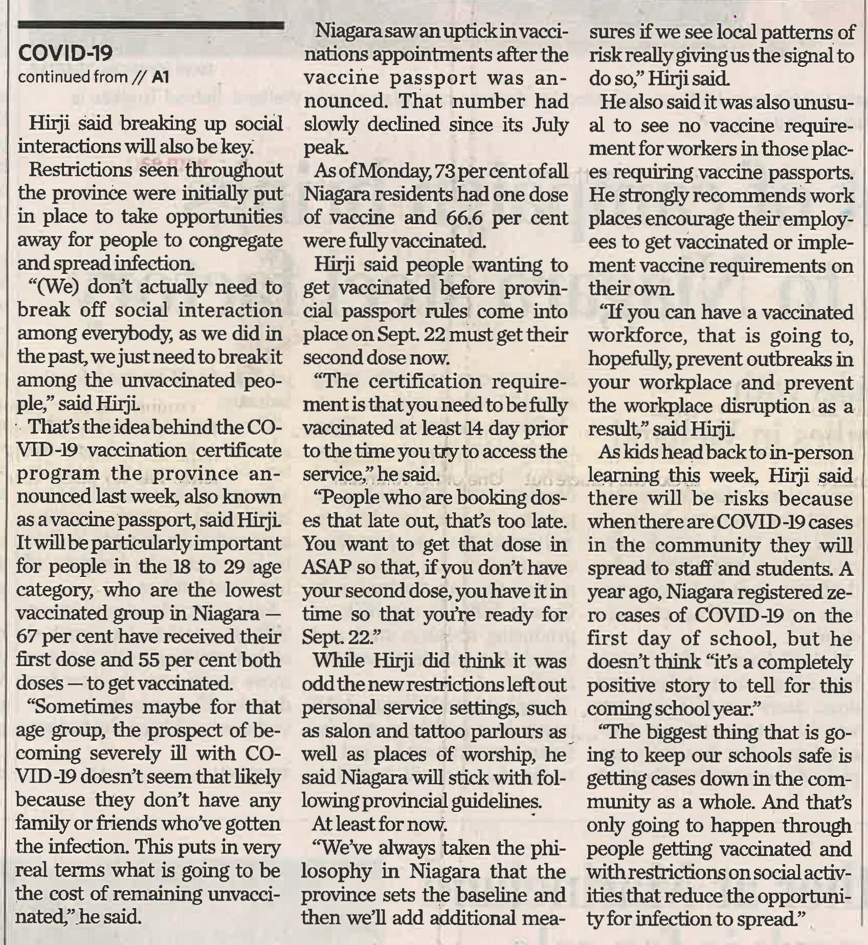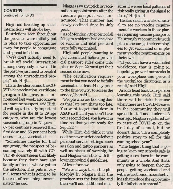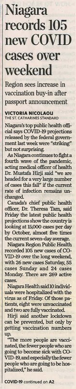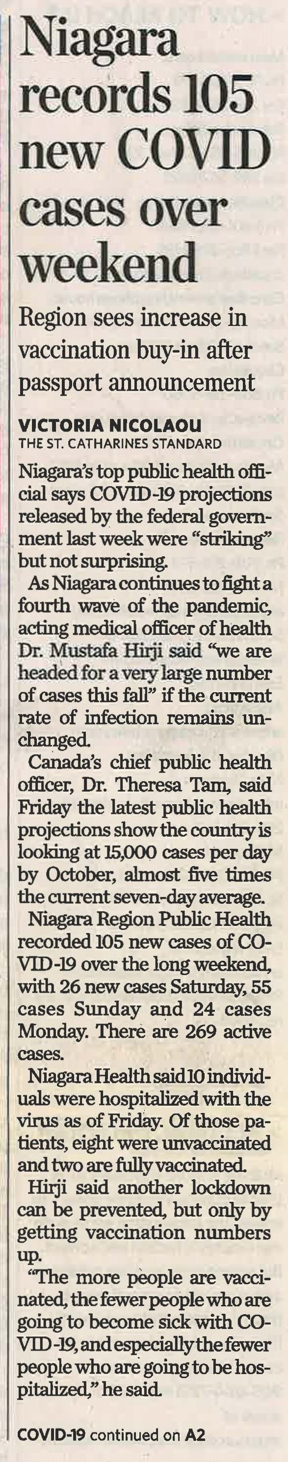 - Niagara records 105 new COVID cases over weekend : Region sees increase in vaccination buy-in after passport announcement