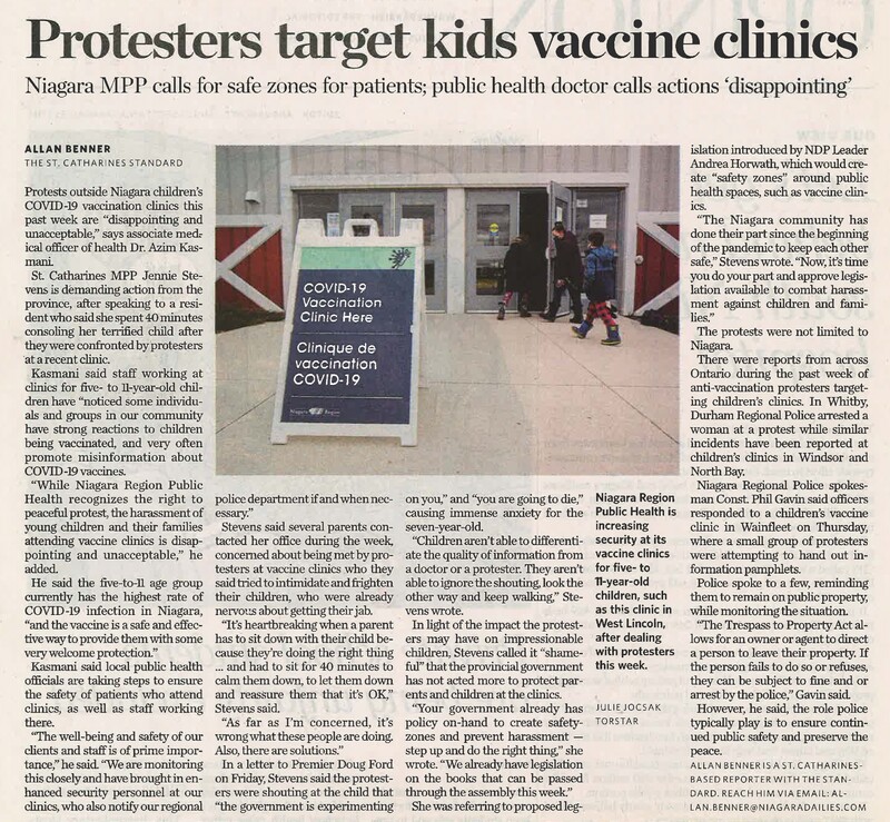 - Protesters target kids vaccine clinics : Niagara MPP calls for safe zones for patients; public health doctor calls actions 'disappointing'