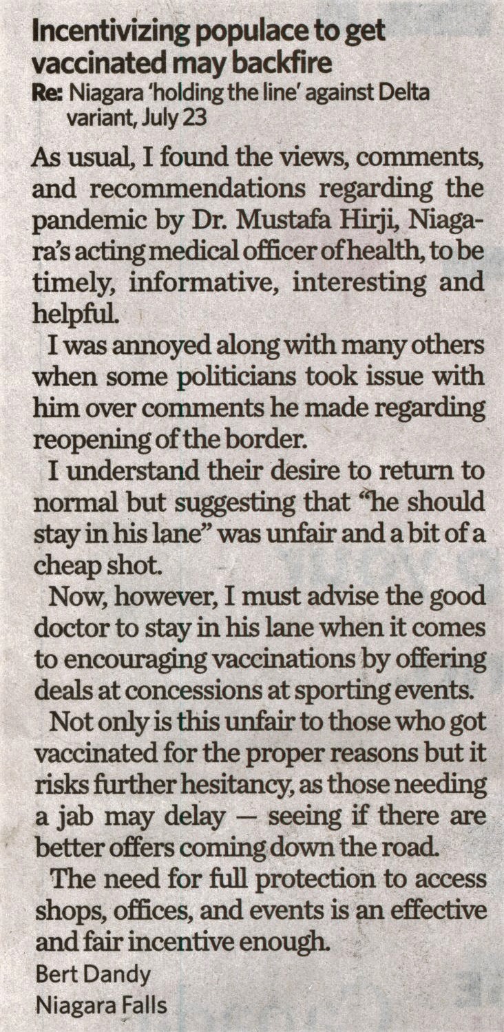 - Incentivizing populace to get vaccinated may backfire : Re: Niagara 'holding the line' against Delta variant, July 23