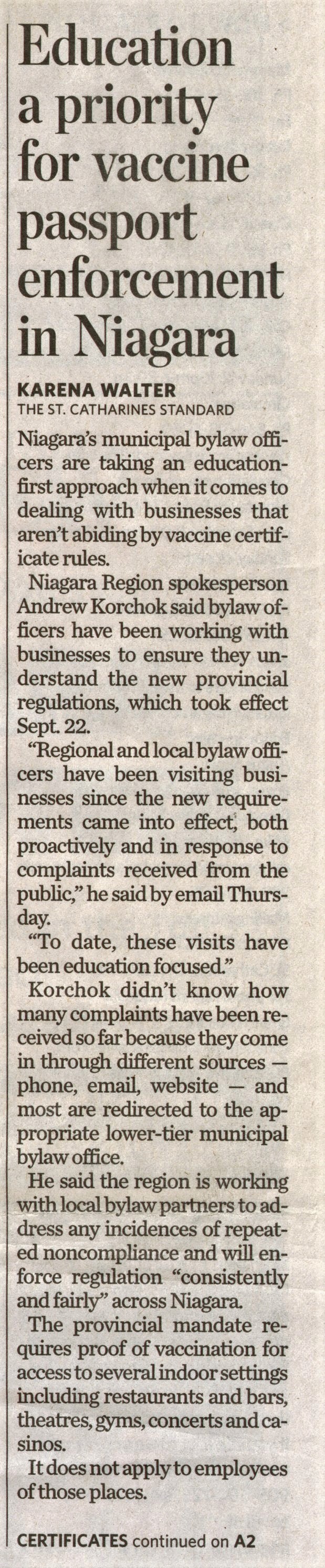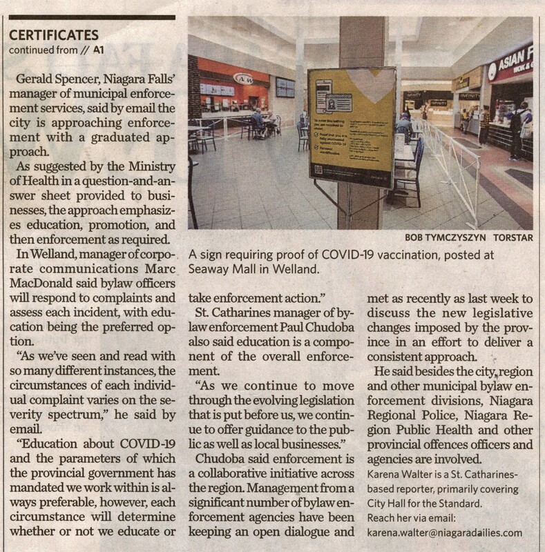 - Education a priority for vaccine passport enforcement in Niagara