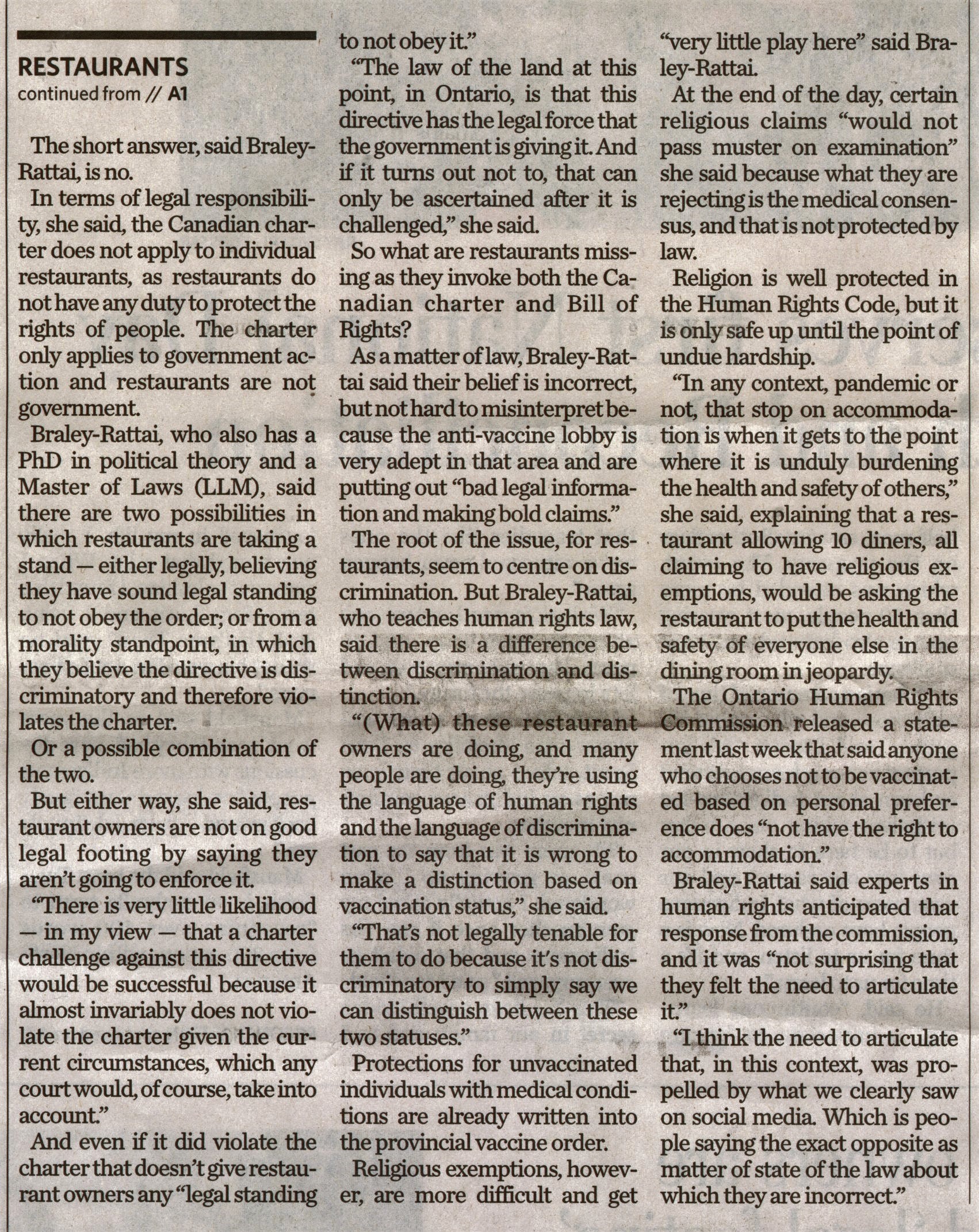 Restaurant owners are not on good 'legal footing' : Professor says there is a difference between discrimination and distinction