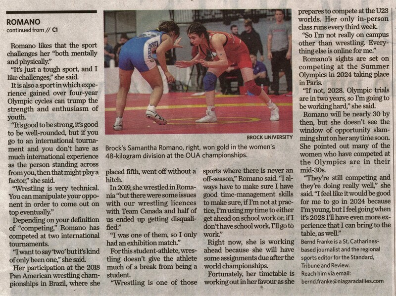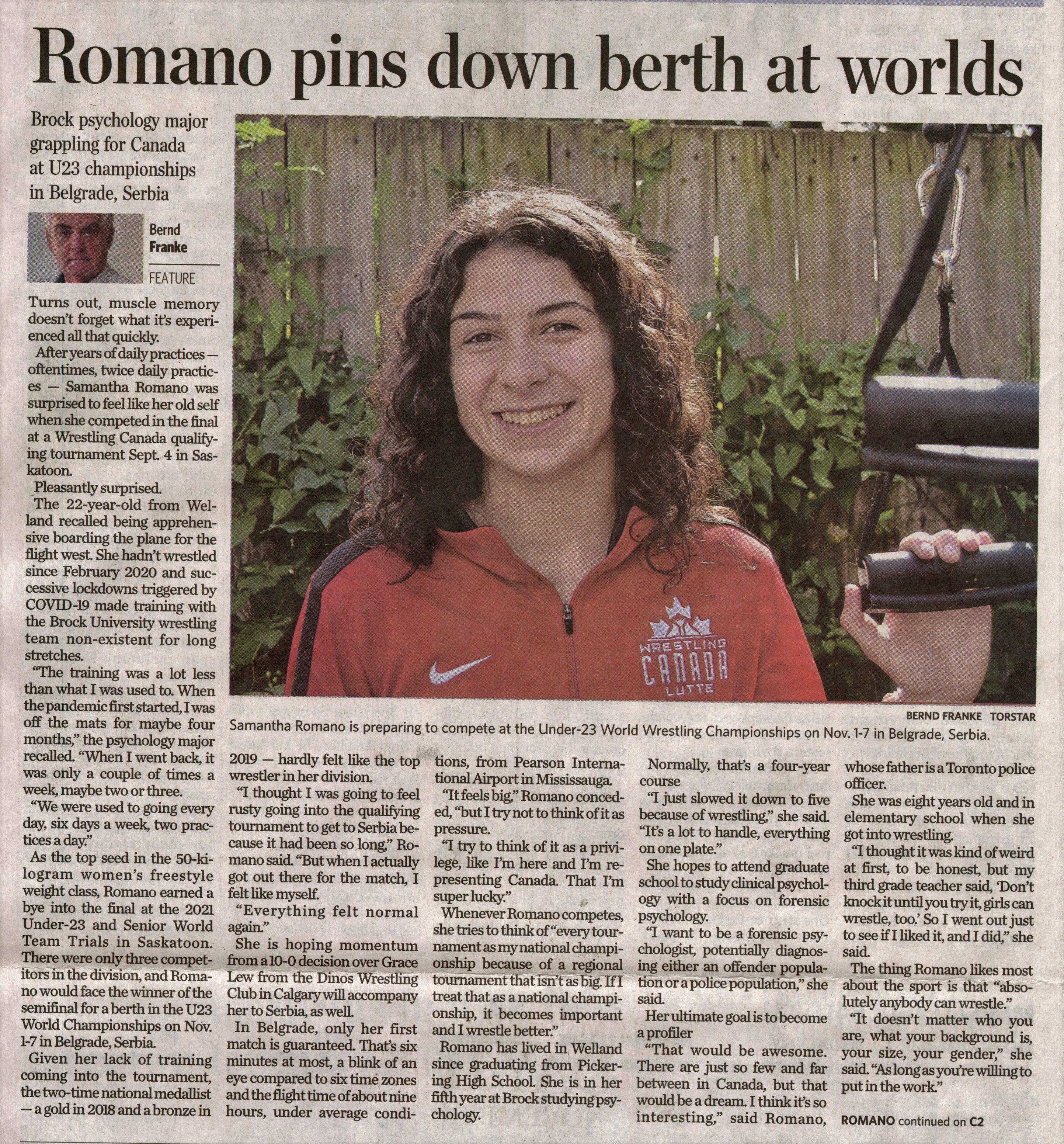 - Romano pins down berth at worlds : Brock psychology major grappling for Canada at U23 championships in Belgrade, Serbia
