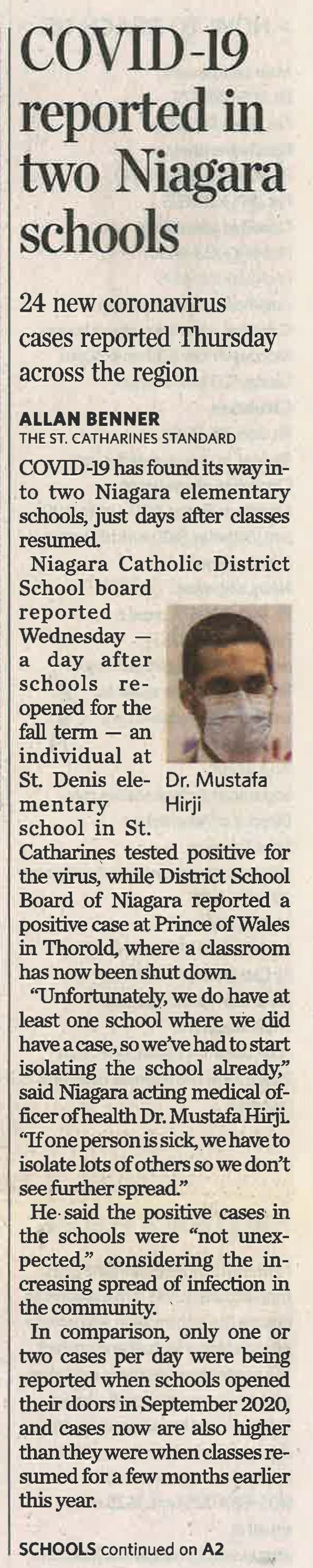 - COVID-19 reported in two Niagara schools : 24 new coronavirus cases reported Thursday across the region