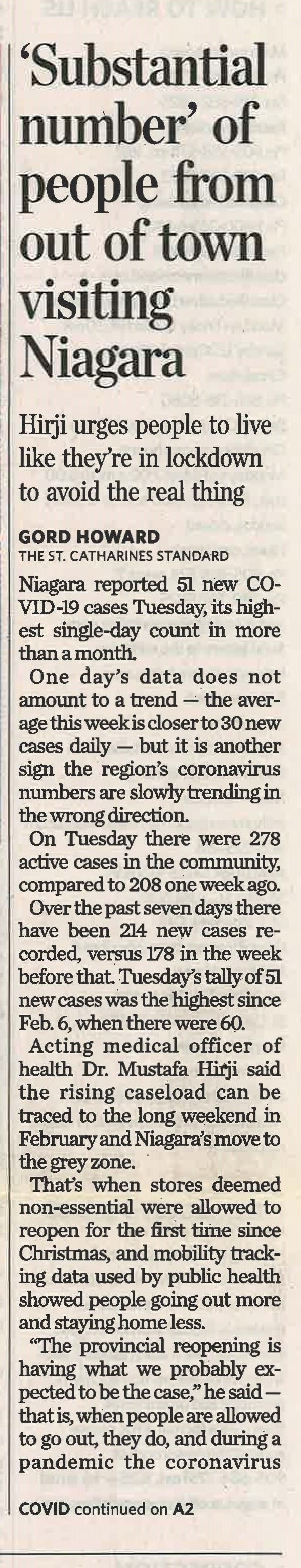 - 'Substantial number' of people from out of town visiting Niagara : Hirji urges people to live like they're in lockdown to avoid the real thing