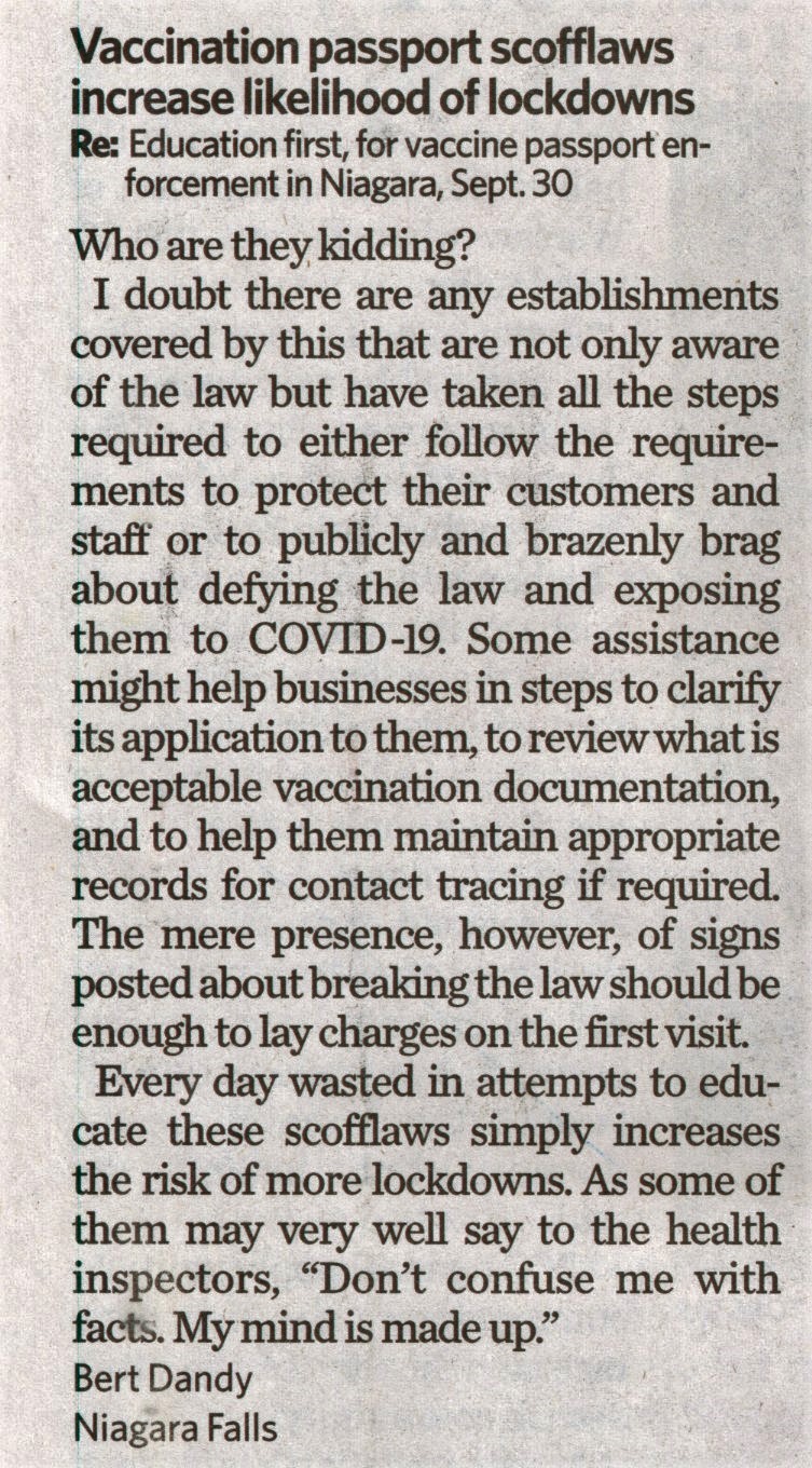 Vaccination passport scofflaws increase likelihood of lockdowns : RE : Education first, for vaccine passport enforcement in Niagara , Sept. 30