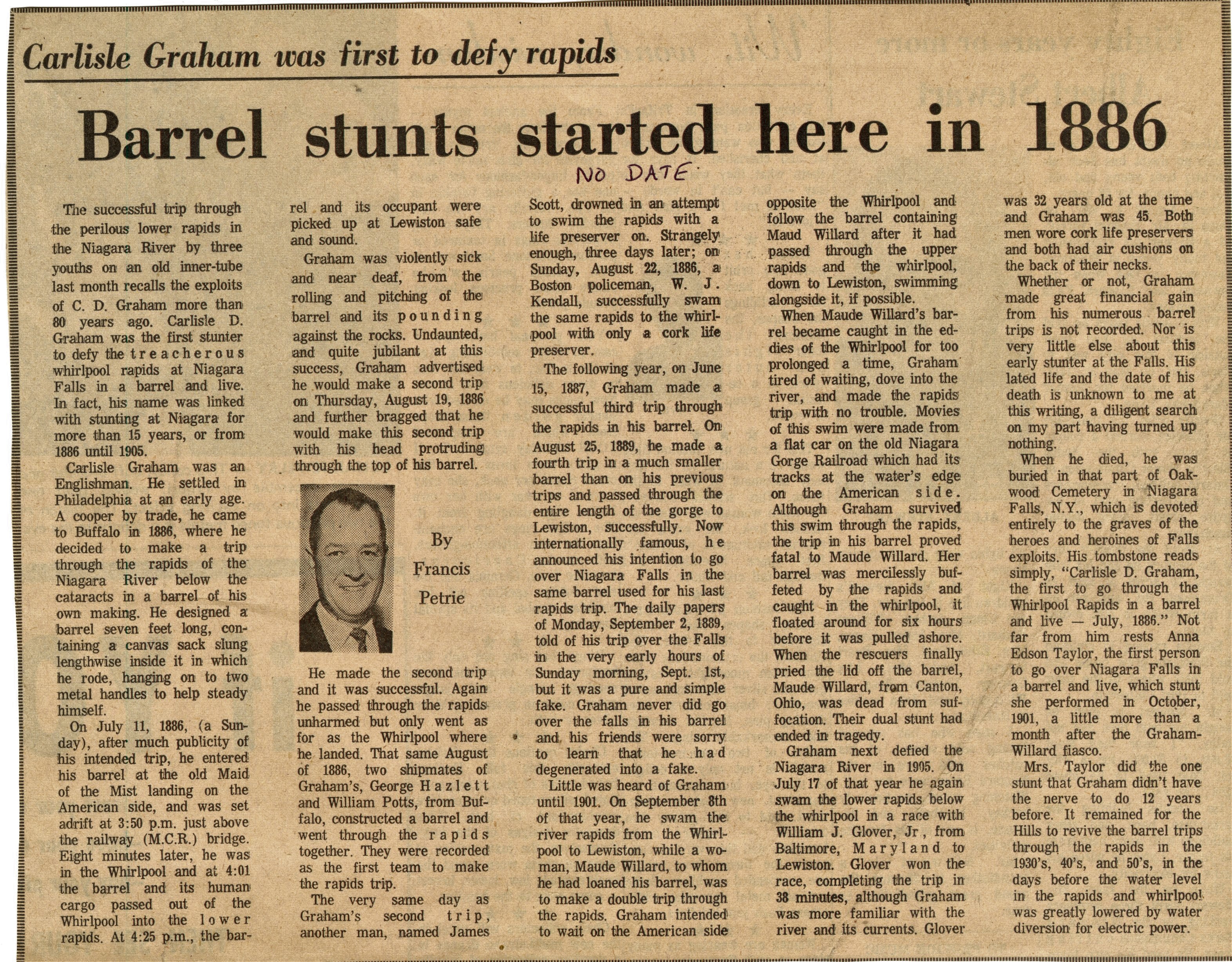Carlisle Graham was first to defy rapids : Barrel stunts started here in 1886 (no date)