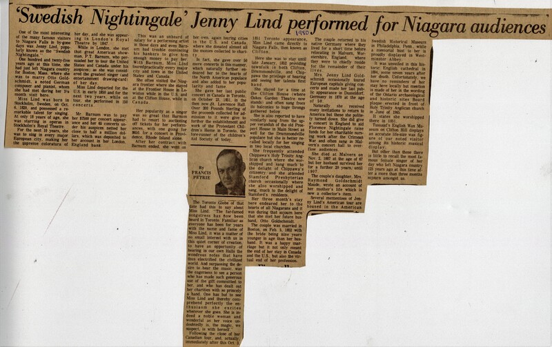 - Lind, Jenny / 'Swedish Nightingale' / Clifton House / Chippawa Holy Trinity Anglican Church / Goldschmidt, Otto / famous singer