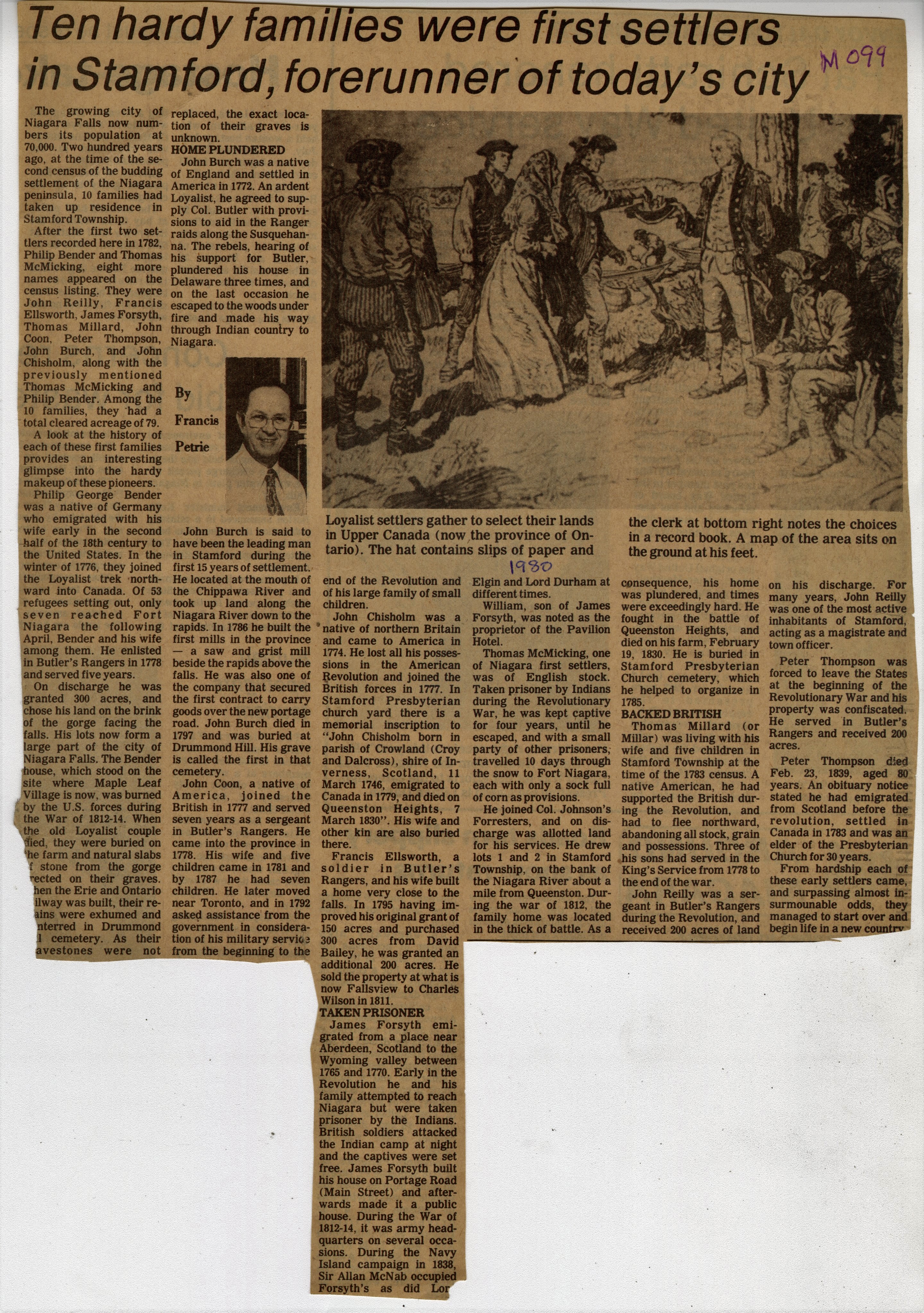 - Settlers / Stamford Township / Bender, Philip / McMicking, Thomas / Reilly, John / Ellsworth, Francis / Forsyth, James / Millard, Thomas / Coon, John / Thompson, Peter / Burch, John / Chisolm, John