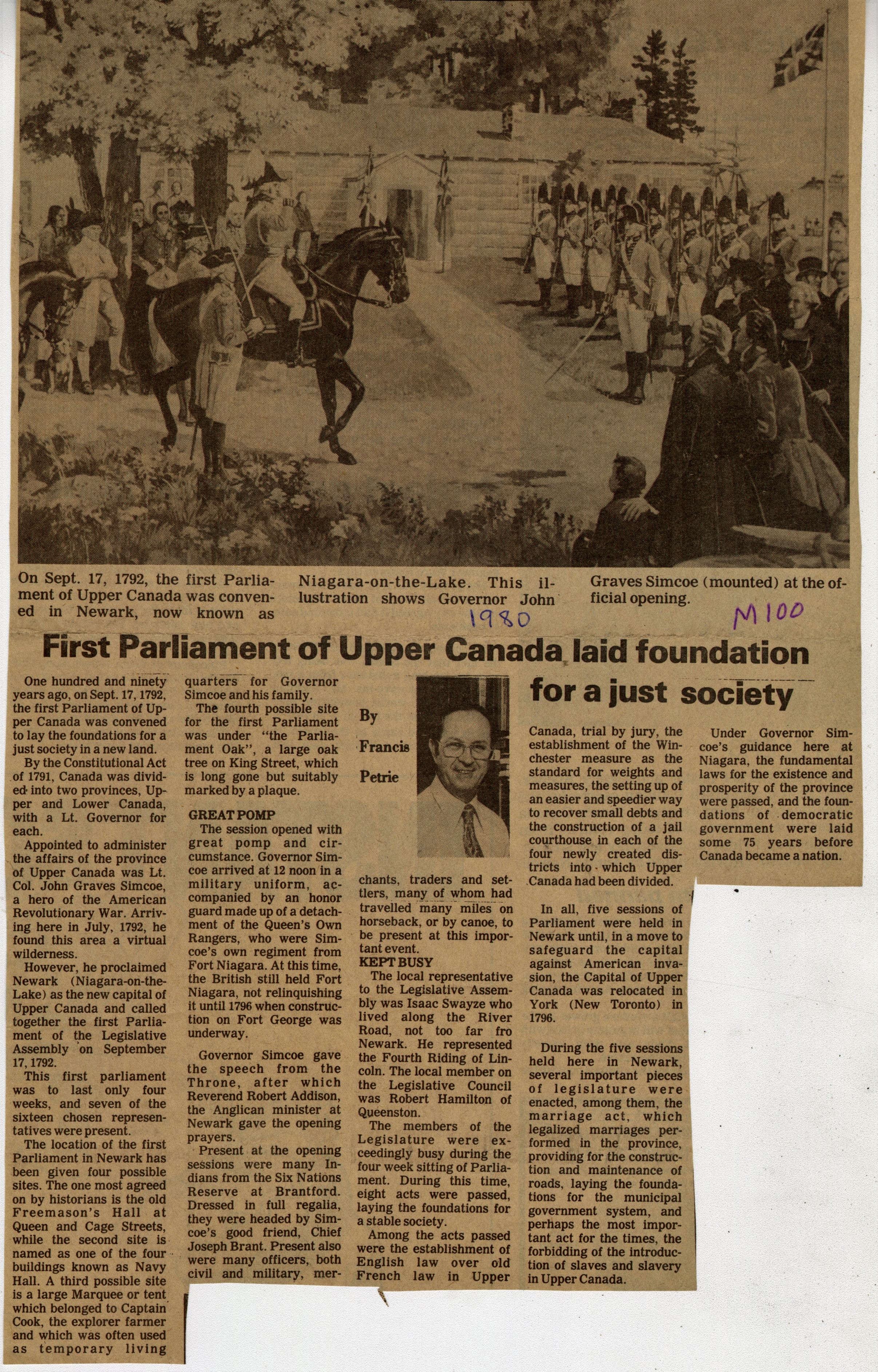 - First Parliament of Upper Canada / Niagara-on-the-Lake / Simcoe, John Graves (Governor)